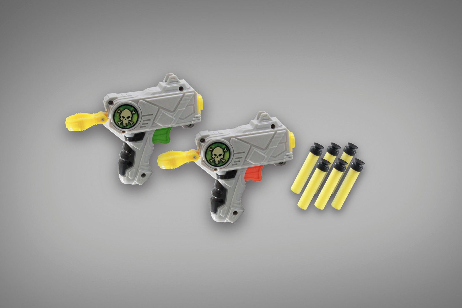 1 suport pentru tinte, 2 pistoale, 6 sageti din spuma moale, 5 mingi din polistiren si instructiuni in limba romana.