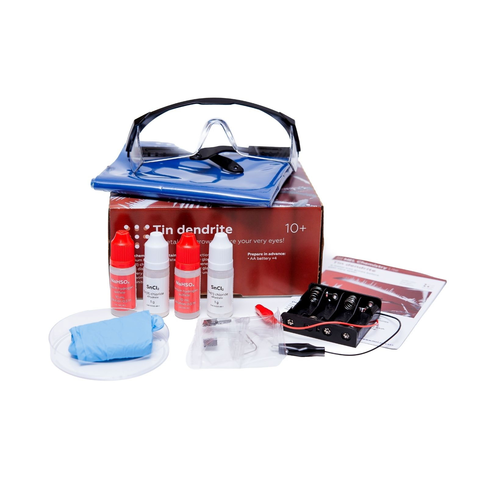 2 doze de bisulfat de sodiu, 2 doze de clorura de staniu, vas Petri, suport de baterie, cartonasul pentru experiment, 4 electrozi de grafit, manusi de nitril, agrafa, ochelari de protectie, protectie pentru zona experimentala, instructiuni.