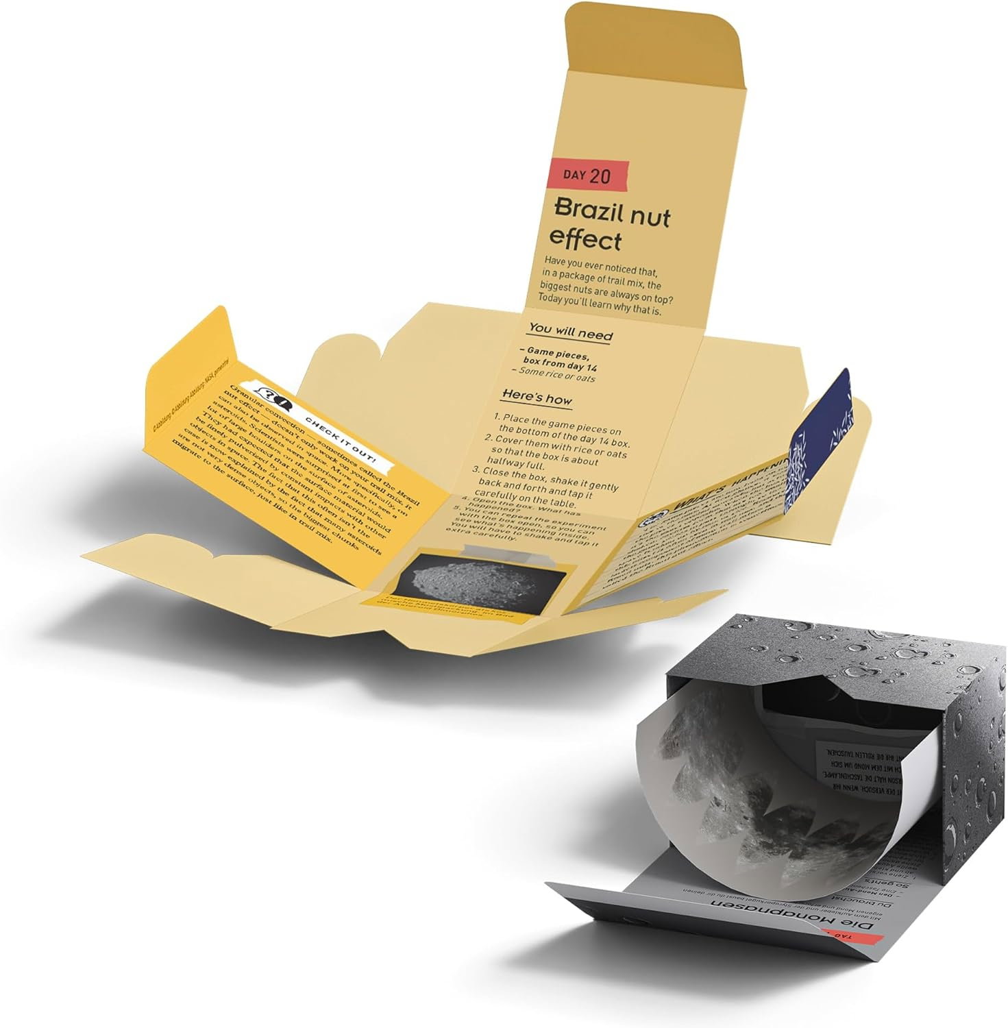 Calendarul include 24 de cutiute individuale, fiecare cu materiale pentru experimente si instructiuni ilustrate, concepute pentru a explora concepte din chimie, biologie si fizica.