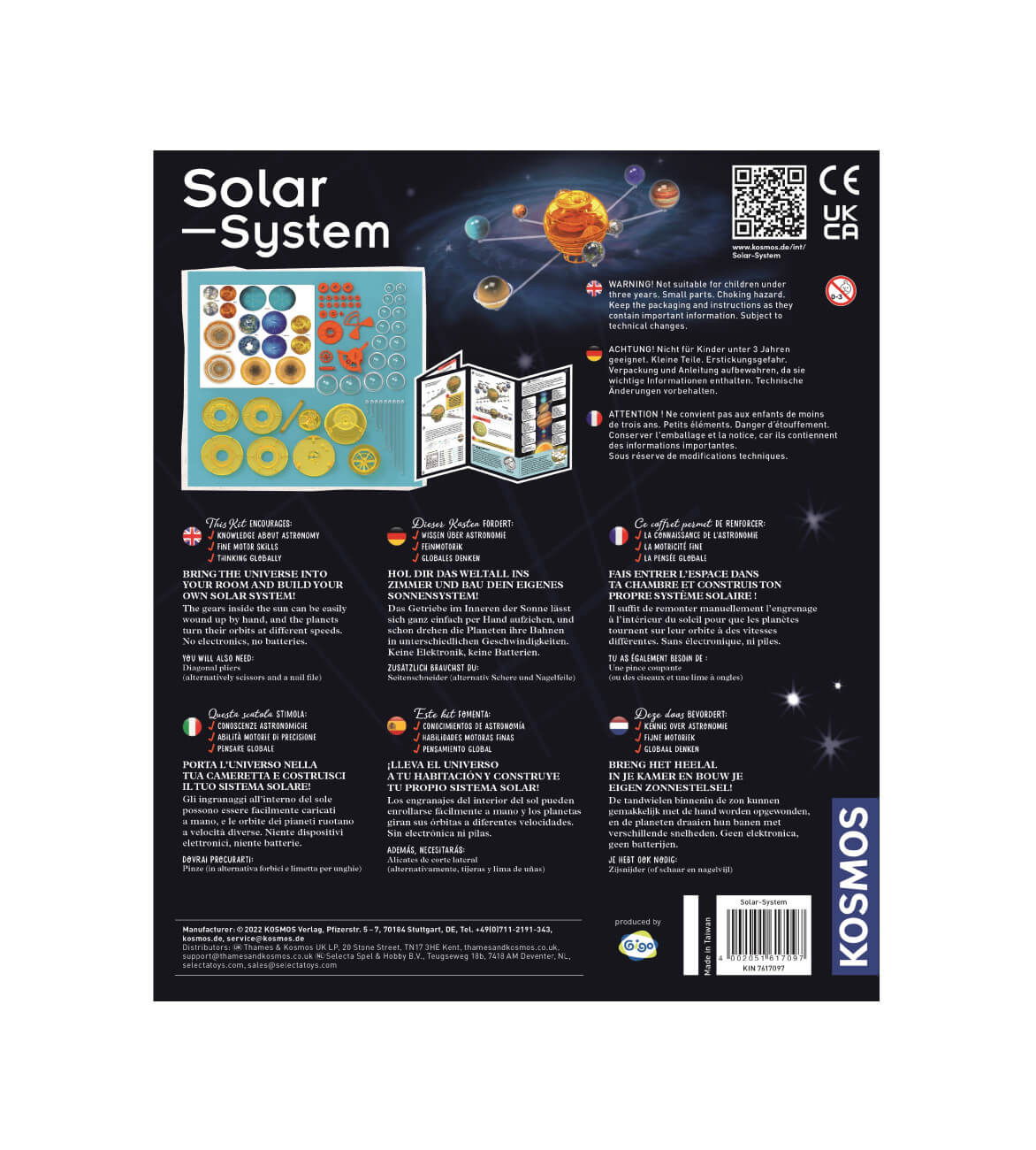 Cu acest set educative STEM aveți de construit un planetariu! Un planetariu este un model mecanic al sistemului solar (sau doar al Soarelui, Pamantului si Lunii) care arata pozitia relativa si miscarea planetelor in jurul Soarelui. Cu toate acestea, acest model arata doar patru viteze orbitale ale planetelor. In realitate, fiecare planeta are propria sa viteza orbitala. Daca planetariul ar fi la scara adevarata, ar trebui sa aiba o lungime de cateva sute de metri, avand in vedere dimensiunea Soarelui din modelul vostru, iar Pamantul ar fi mai mic decat varful unui ac.