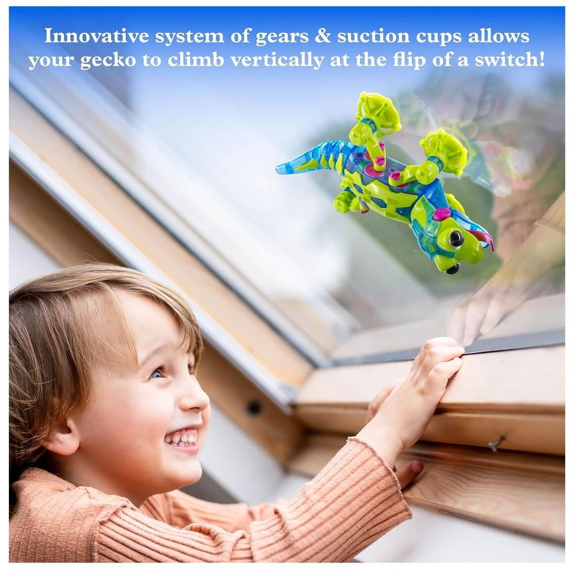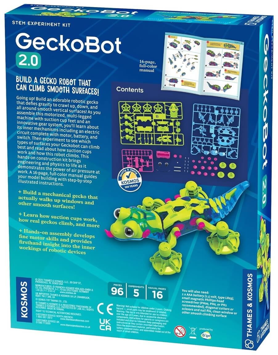 Descopera fascinanta lume a roboticii si a stiintei cu Kitul de constructie Robot Geckobot 2.0. Acest set STEM iti permite sa construiesti un robot gecko motorizat care poate urca pe ferestre, oglinzi sau alte suprafete netede. Datorita sistemului sau ingenios de ventuze si angrenaje, Geckobot 2.0 se misca asemenea unui adevarat gecko, demonstrand principiile presiunii aerului si ale mecanicii intr-un mod distractiv si educativ.