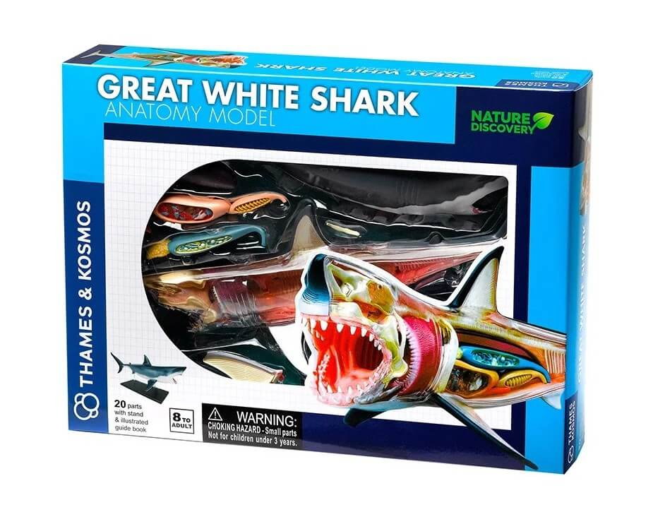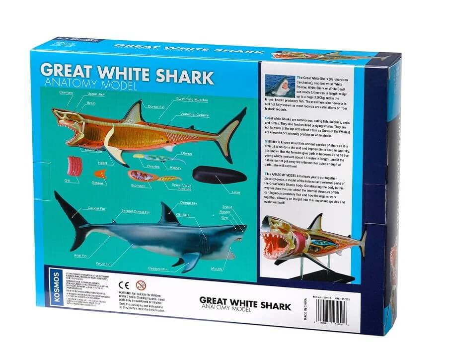 In Set educativ Anatomia animalelor: Rechinul Alb (EN), utilizatorul asambleaza fiecare componenta pentru a reconstrui corpul rechinului, descoperind pe parcurs rolul fiecarui organ si modul in care acestea functioneaza impreuna. Dupa finalizare, modelul poate fi expus precum o piesa de muzeu, oferind o perspectiva clara asupra anatomiei acestui pradator marin.