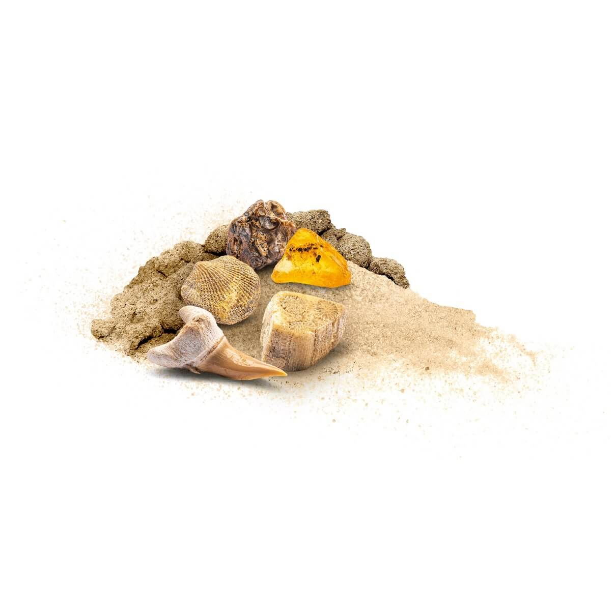 2 unelte (dalta si ciocan), 1 burete, 1 bloc de ipsos cu 5 minerale (fosila dintelui de rechin, fosila de rasina - chihlimbarul, scoica Atrypa, coralul de piatra si amonoidul) si instructiuni in limba romana
