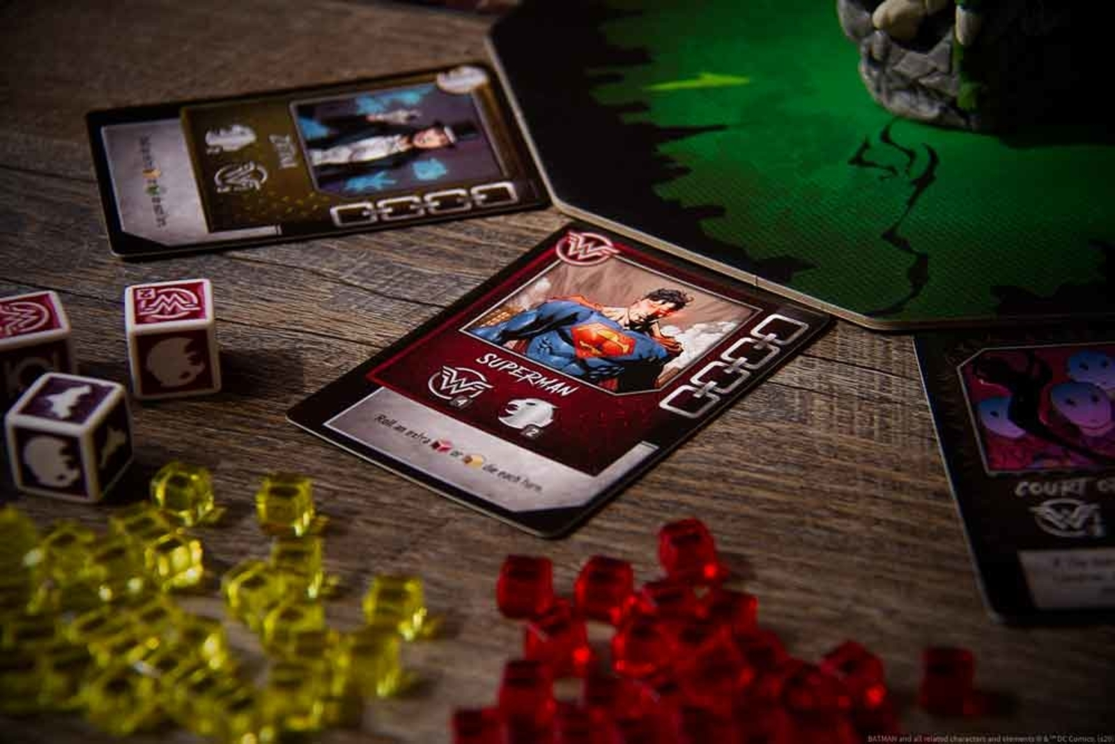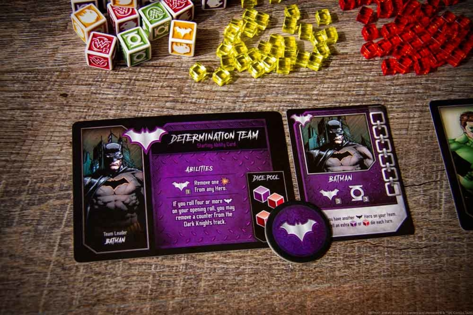 4 cartonase pentru abilitatile echipei, 4 jetoane pentru implementarea echipei, 1 placa pentru implementare, 38 de cartonase cu personaje (eroi si raufacatori), 1 figurina „Batman Who Laughs", 30 de jetoane cu bonusuri, 15 zaruri ale eroilor, 7 cartonase „Cavalerii intunericului”, 60 de cuburi pentru indicarea avariilor, 32 de cuburi pentru indicarea „Cavalerilor intunericului”, 4 planse de joc fata-verso „Cavalerii intunericului”, 1 zar pentru „Cavalerii intunericului”, 1 zar pentru „Batman Who Laughs" instructiuni.
