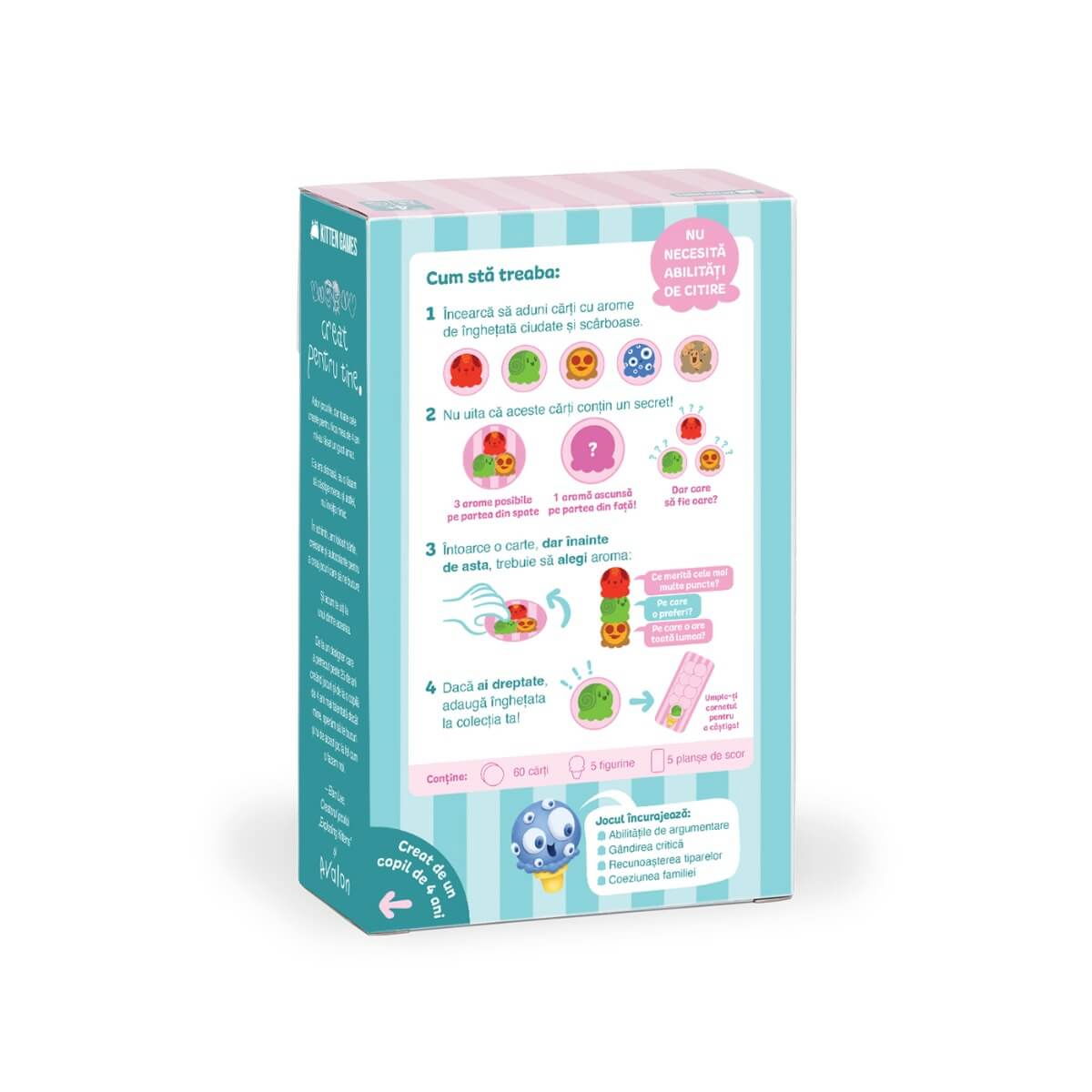 Jucatorii intorc carti si aleg aroma pe care cred ca o vor descoperi, pe baza posibilitatilor afisate pe spatele cartilor. Daca ghicesc corect, adauga inghetata in conul lor. Unele arome sunt simpatice, altele… cu adevarat dezgustatoare, dar toate fac parte din distractie. Castiga jucatorul care construieste cel mai spectaculos si ciudat con, intr-un ritm rapid si prietenos pentru cei mici.
