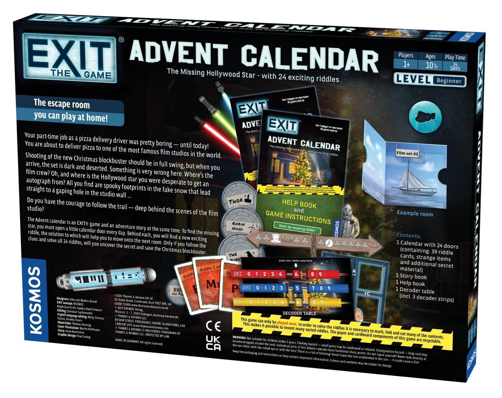 Jocul include un calendar de Advent cu 24 de compartimente, fiecare ascunzand o ghicitoare noua, materiale pentru joc, indicii tematice si instructiuni pentru desfasurarea aventurii.