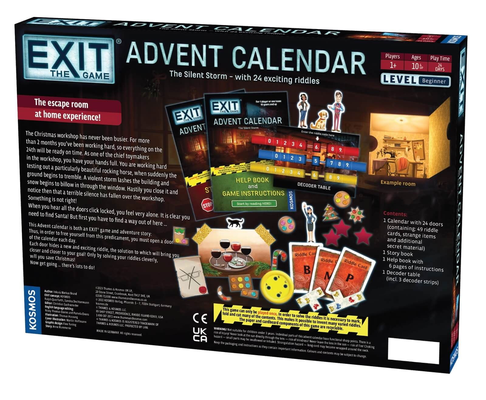 In Exit Advent Calendar: The Silent Storm (EN), jucatorii deschid cate o usa a calendarului in fiecare zi din decembrie, descoperind zilnic o noua ghicitoare. Fiecare puzzle dureaza aproximativ 10–15 minute si dezvaluie indiciile necesare pentru a afla ce usa trebuie deschisa in continuare. Scopul este sa rezolvi toate cele 24 de provocari pentru a iesi din atelierul blocat si a-l gasi pe Mos Craciun inainte ca furtuna sa distruga Craciunul. Jocul este complet analogic, fara componente electronice, oferind o experienta autentica de escape room de acasa.