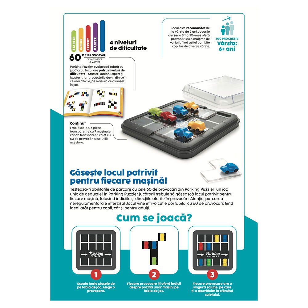 Parking Puzzler este un joc de logica din seria Smart Games, bazat pe puzzle-uri glisante, care provoaca jucatorii sa gaseasca pozitia corecta pentru fiecare masina pe tabla de joc. Cu un design atractiv si o cutie portabila, jocul include 60 de provocari cu dificultate progresiva, fiind potrivit atat pentru copii, cat si pentru adulti.