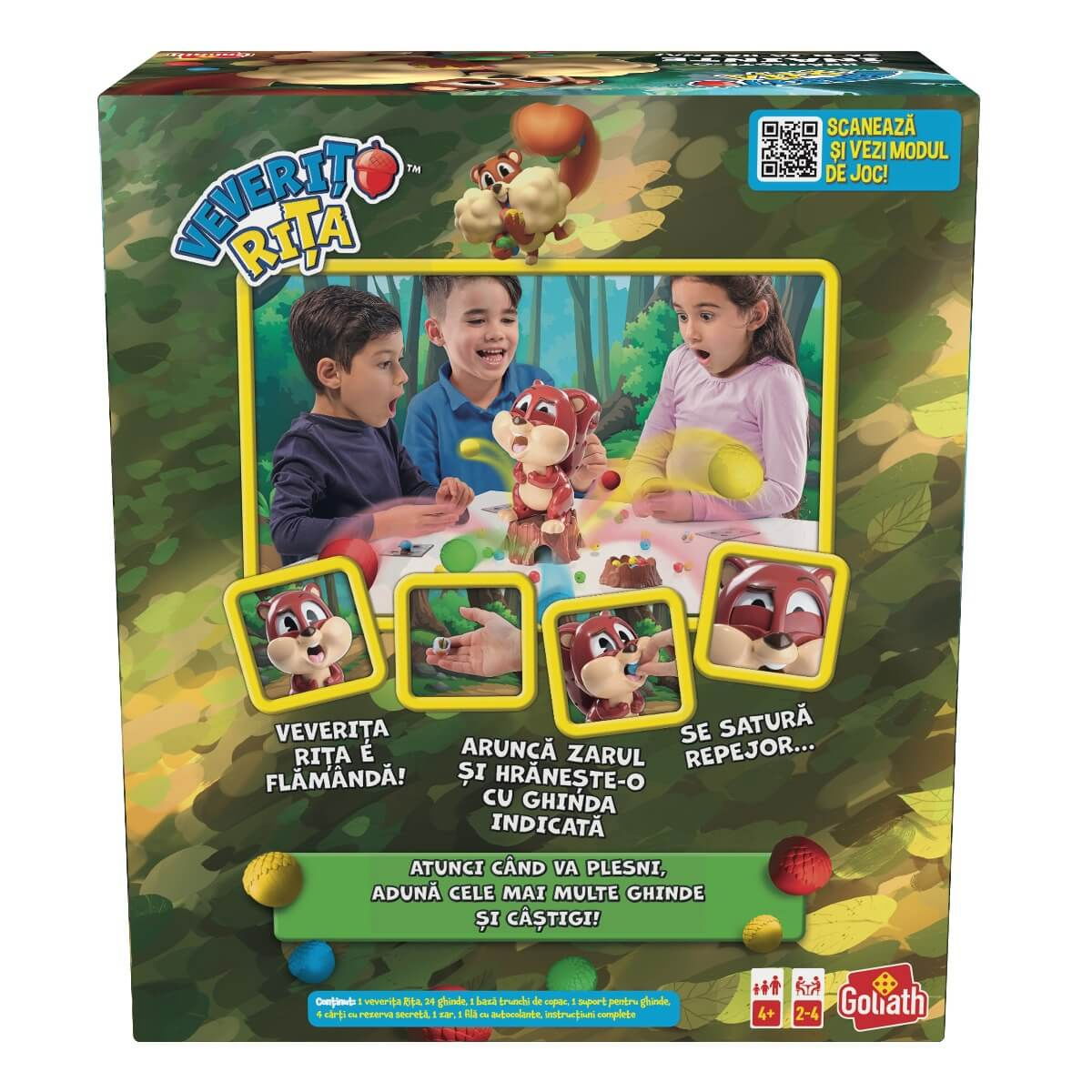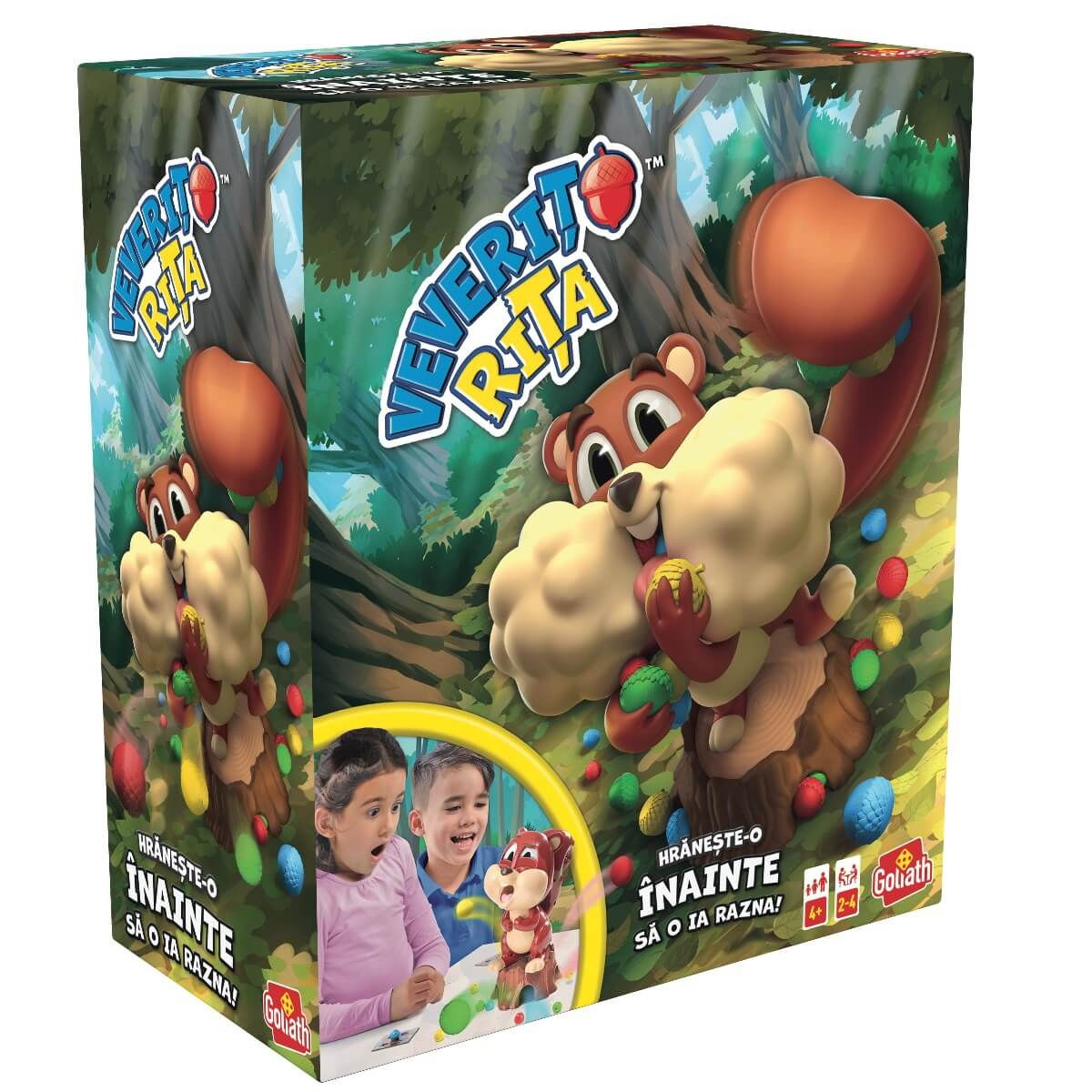 Veverita Rita (RO) este un joc de familie amuzant si alert, in care micii jucatori o ajuta pe Rita sa isi pregateasca proviziile pentru iarna. Dai cu zarul, alegi ghinda potrivita si o hranesti pe Rita, dar ai grija: pleoapele ei se inchid treptat si nu stii niciodata cand va plesni, imprastiind ghindele din copac.