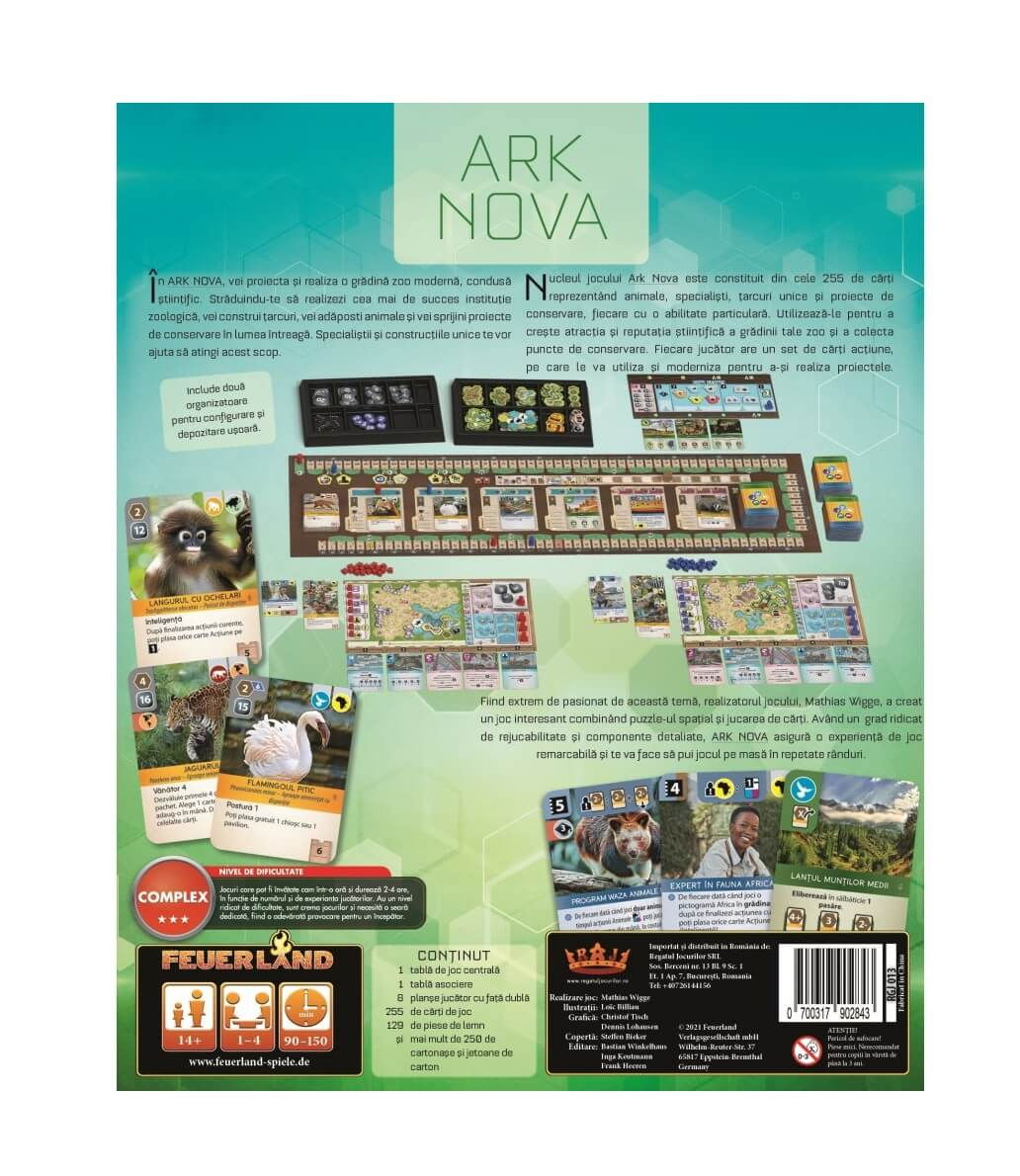 Mathias Wigge, realizatorul jocului, a combinat puzzle-ul spatial cu jocul de carti. Ark Nova (RO) poate fi jucat din nou si din nou, multumita componentelor sale detaliate. Acesta poate fi incadrat in categoria de complexitate mai ridicata, fiind notat cu 3 stele. Poate fi invatat in maxim o ora si jucat in maxim 2-4 ore.