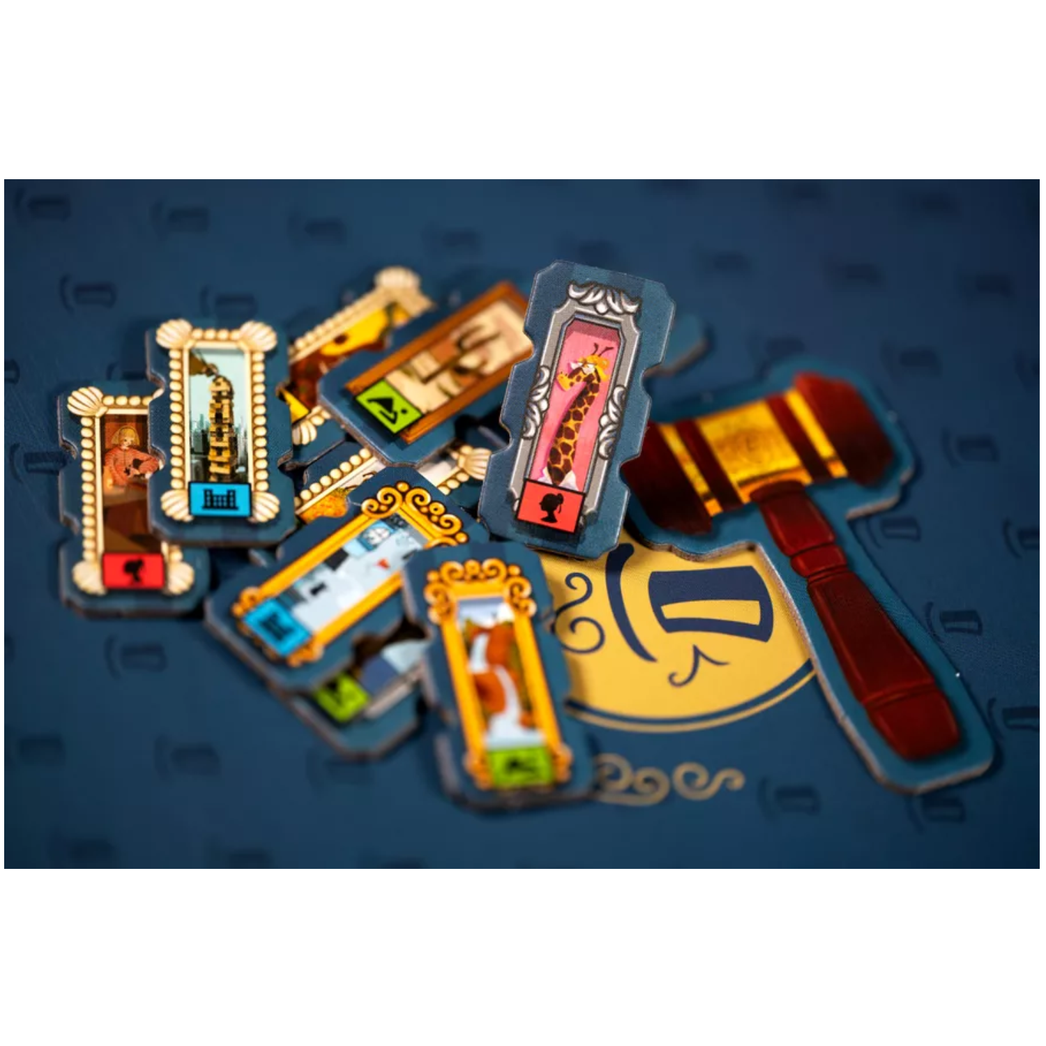 116 piese tablou, 108 piese decoratiune, 4 planse pentru jucatori, 1 plansa muzeu, 20 palete de licitatie per jucator, 4 palete licitatie start, 4 jetoane prestigiu, 8 jetoane scor (2 per jucator), 4 jetoane bonus pentru perete complet, 7 jetoane valoare tablou (3–9), 1 ciocanel de licitatie, 4 carti de ajutor, regulament in limba romana.