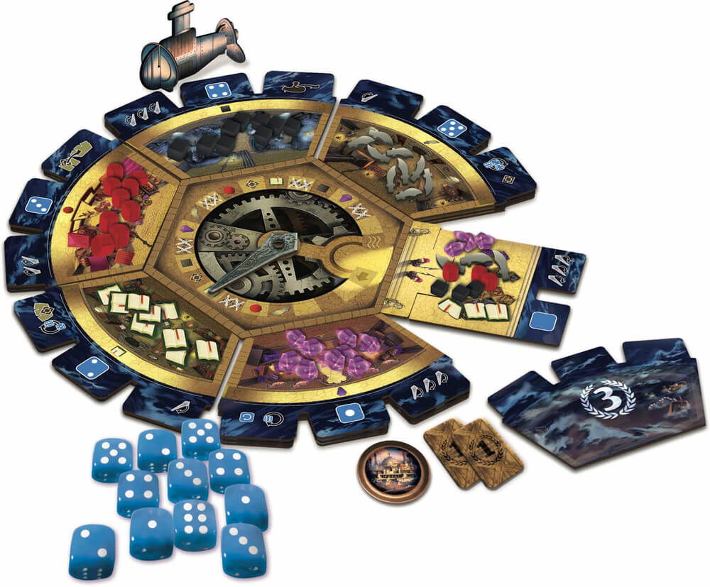 1 tabla de joc cu doua zone principale: Ceas si Piata Neagra, 15 piese Zone (3 Bijutieri, 3 Biblioteci, 3 Hanuri, 3 Ateliere, 3 Fierarii), 1 pion Submarin, 9 zaruri transparente Portile Orasului, 60 Resurse (12 Pietre pretioase, 12 Carti, 12 Provizii, 12 Unelte, 12 Arme), 1 jeton pentru primul jucator, Puncte de victorie si instructiuni de joc in limba engleza.