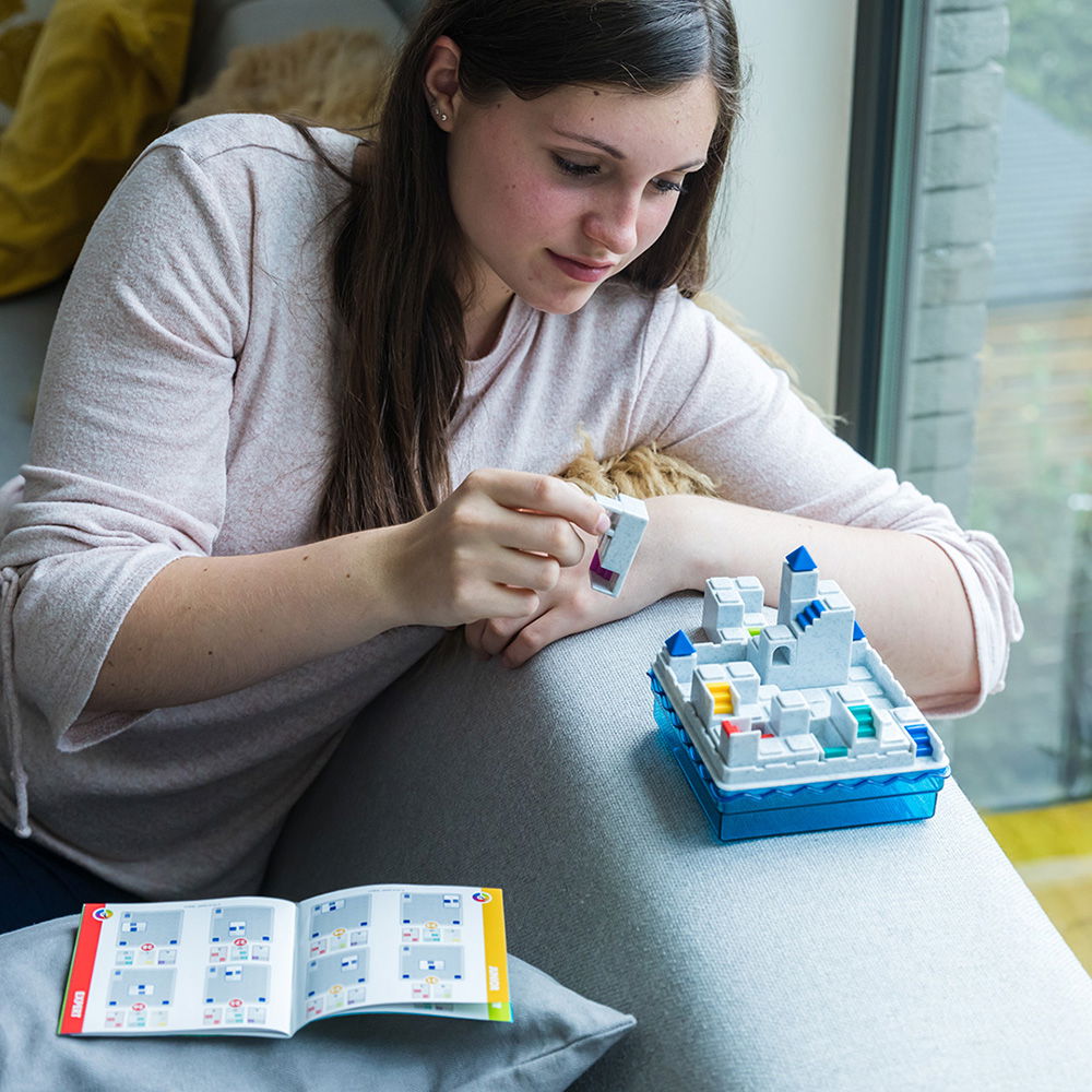 1 tabla de joc, un turn, 5 piese de puzzle cu trepte, poduri si tuneluri, un capac transparent si o brosura cu cele 60 de provocari si solutiile acestora.