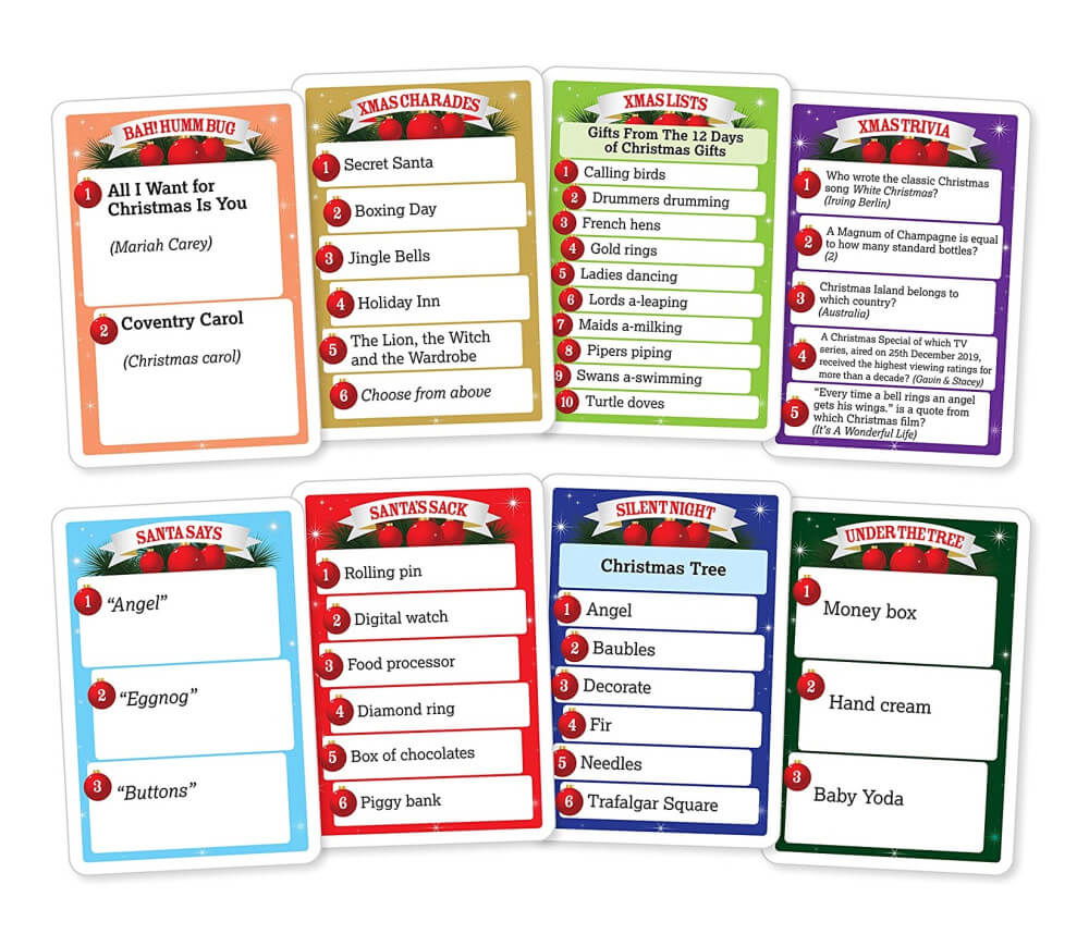Xmas Charades, Santa's Sack, Xmas Lists, Santa Says, Bah! Humm bug, Under the Tree, Silent Night si Xmas Trivia.