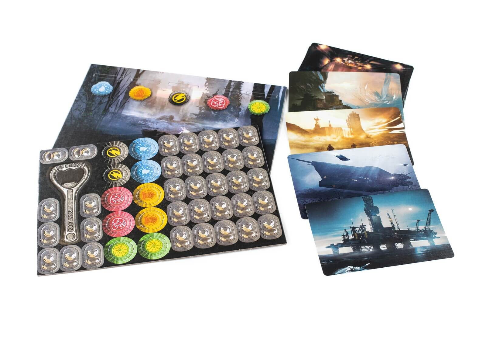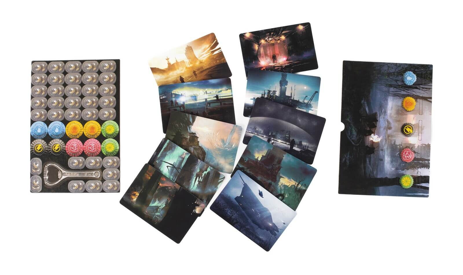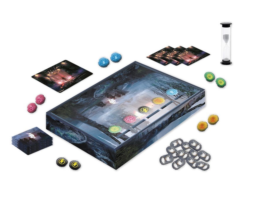 30 cartonase cu intrebari, 10 cartonase cu scenarii, 30 cartonase cu evenimente, 10 jetoane factiune, 1 capac pentru urna de vot, 1 clepsidra de 45 de secunde, 1 desfacator de sticle, 30 jetoane pentru vot, 1 regulament in limba romana.