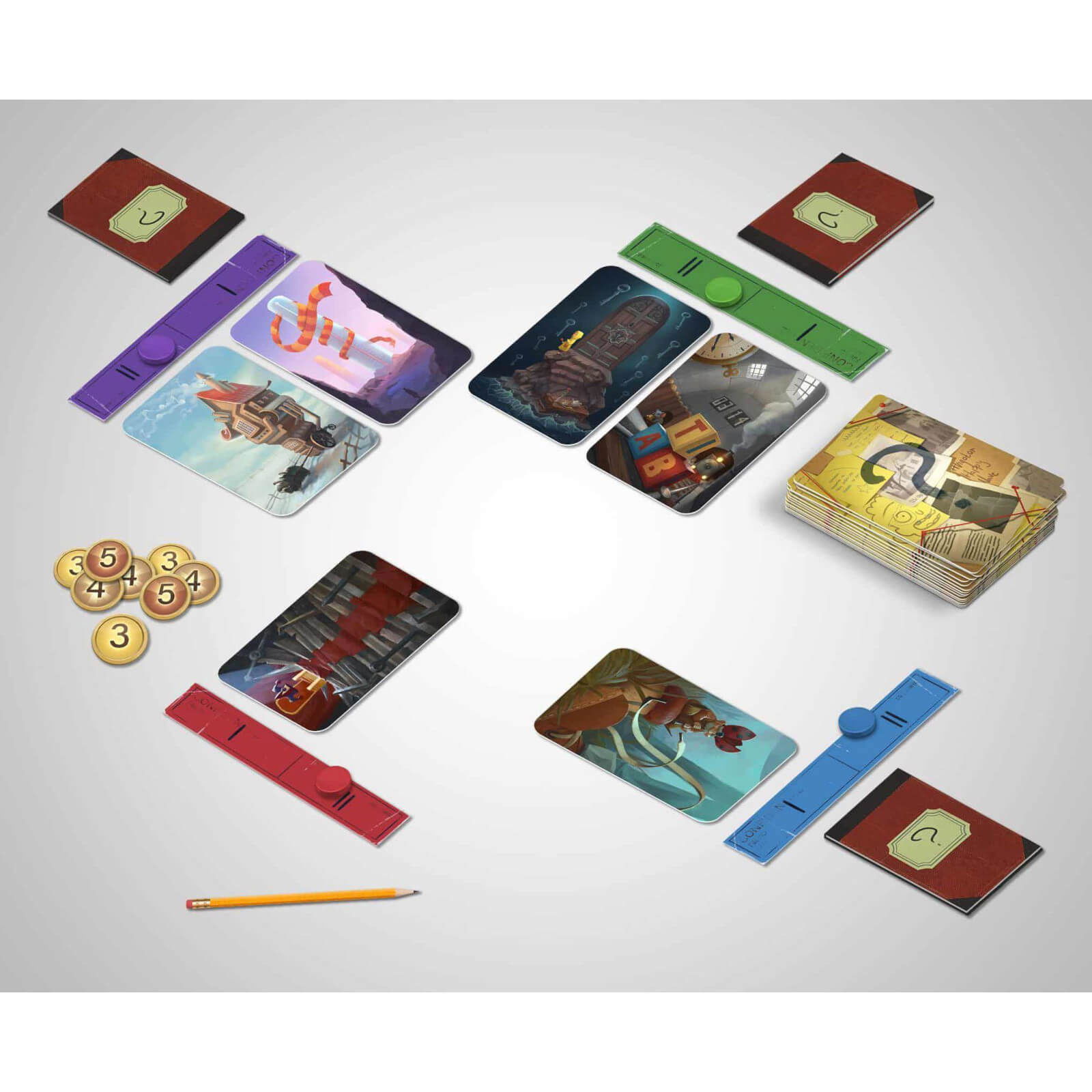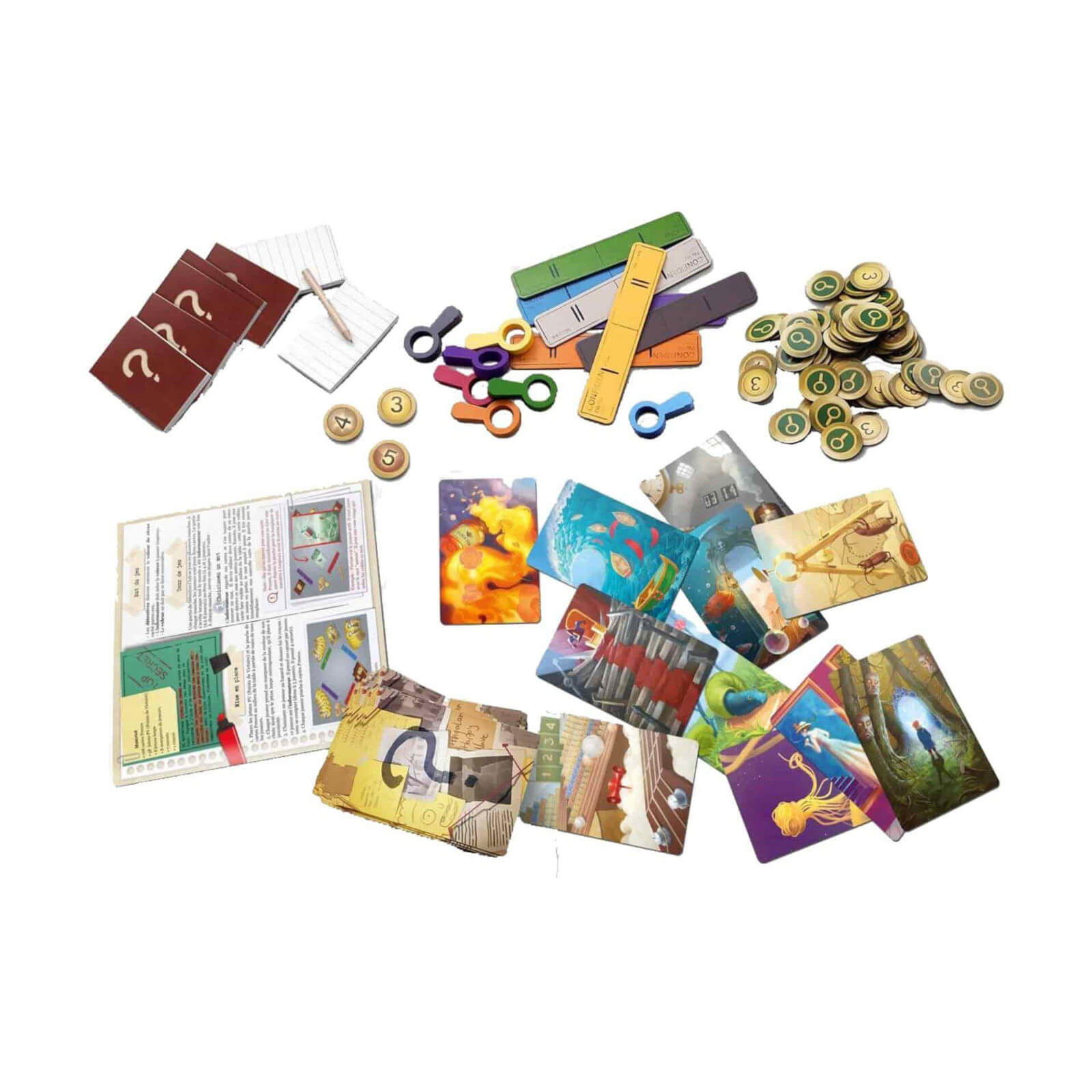 169 de carti cu imagini abstracte, 68 jetoane Punct de victorie, 8 piese colorate Lupa, 7 carnetele, 1 creion si instructiuni de joc in limba romana.