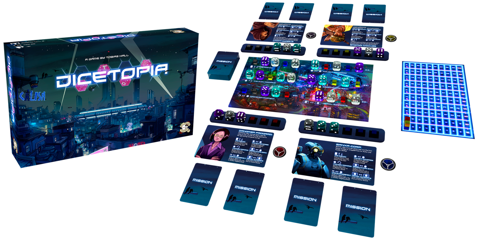 Sub lumini de neon, Dicetopia (EN/FRDE) iti deschide portile catre lumea ticalosilor, corporatiilor viclene și contrabandistilor. Esti pregatit sa-ti folosesti gandirea strategica pentru a prelua controlul asupra cartierelor, pentru a duce la bun sfarsit misiuni secrete si pentru a demonstra ca cel mai periculos pradator este omul?