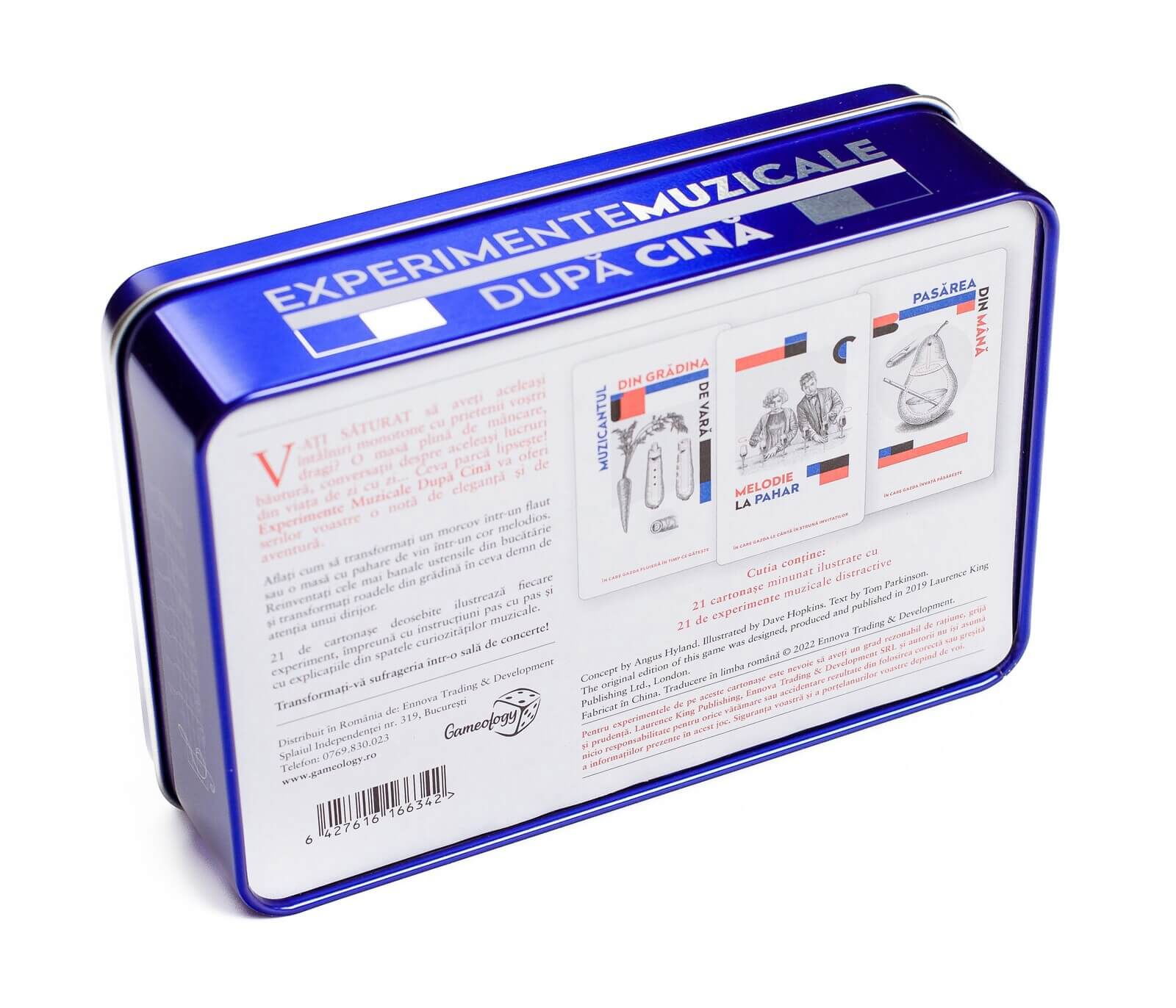 Experimente Muzicale dupa Cina (RO) include o cutie de metal atragatoare ce contine 21 de cartonase ilustrate cu experimente muzicale distractive. Fiecare experiment este portretizat alaturi de instructiuni pas cu pas, explicatii si informatii legate de curiozitatile muzicale.