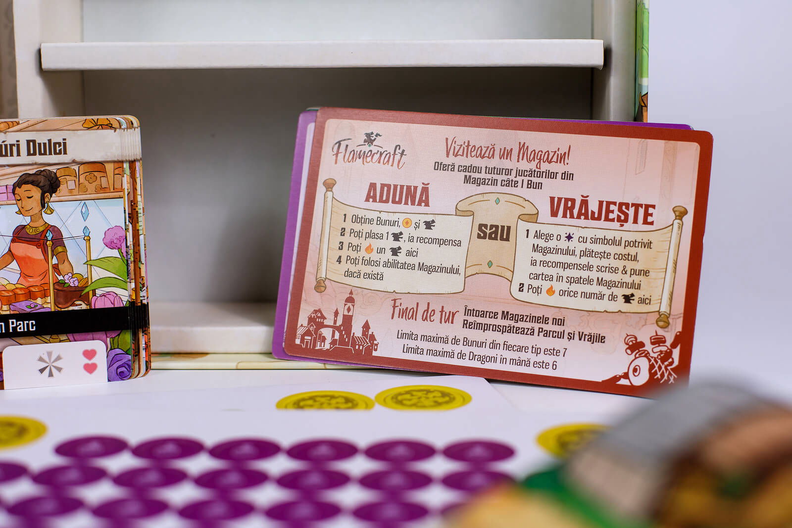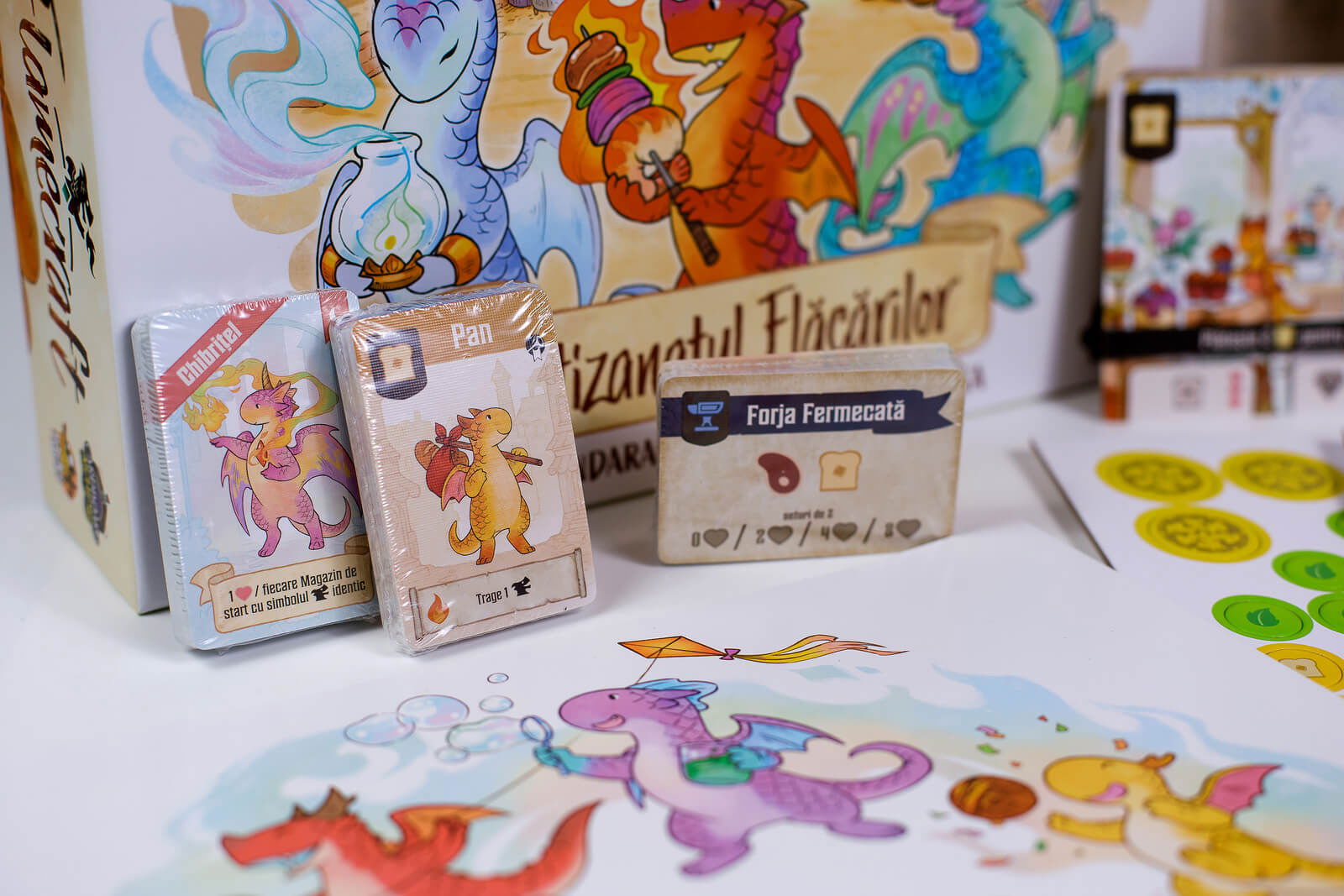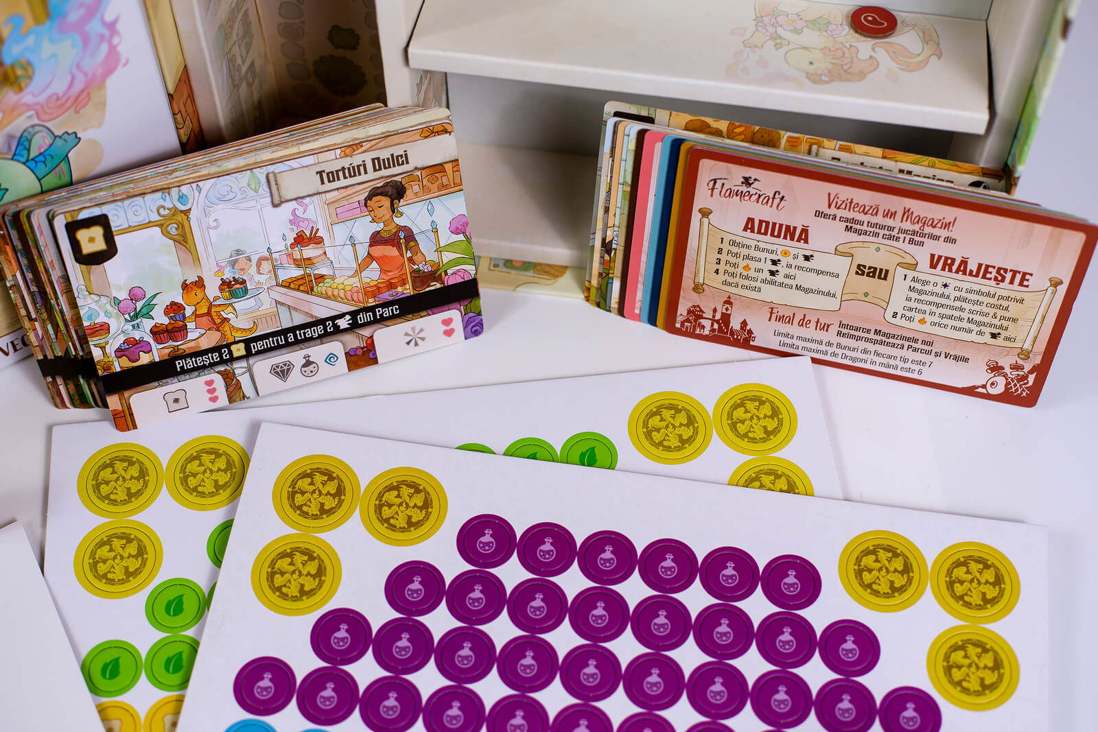 Intra in lumea Flamecraft (RO), un taram magic in care un oras se trezeste la viata, iar dragonii artizani fac prajituri si cafea! In acest joc superb ilustrat, 1-5 jucatori iau rolul unor Gardieni ai Flacarilor, strangand obiecte, plasand dragoni si aruncand vraji pentru a dezvolta magazinele din oras.