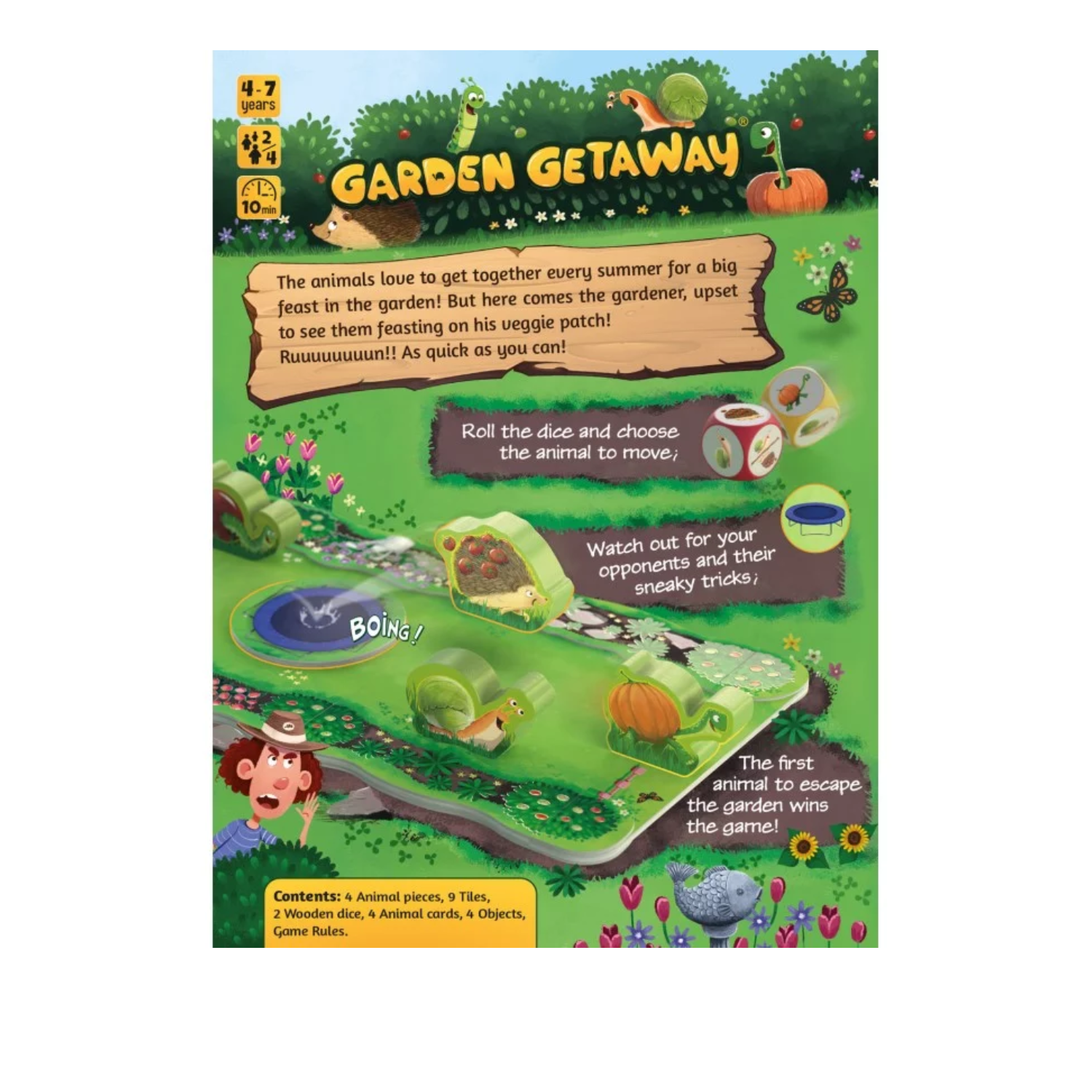 Garden Getaway (EN) este un joc amuzant si plin de culoare pentru copii, in care animalele din gradina pornesc intr-o cursa haotica spre libertate. Jucatorii controleaza aceste simpatice personaje si incearca sa le ajute sa evadeze din gradina inainte sa fie oprite. Jocul combina norocul cu deciziile rapide si este perfect pentru cei mici care invata sa anticipeze si sa se distreze impreuna.