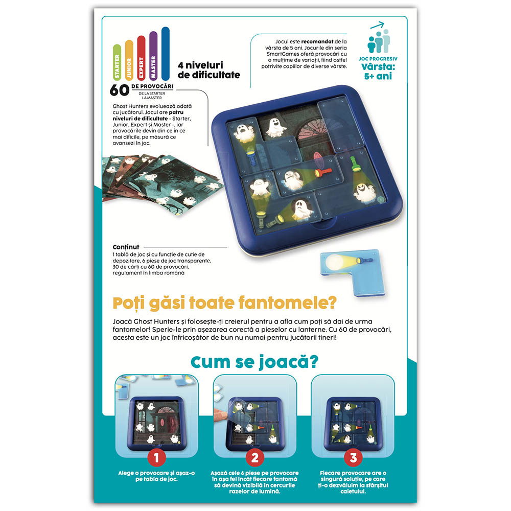 Jocul pentru copii Ghost Hunters (RO) contine 60 de provocari distractive ce pot fi rezolvate prin miscarea pieselor de pe tabla de joc.