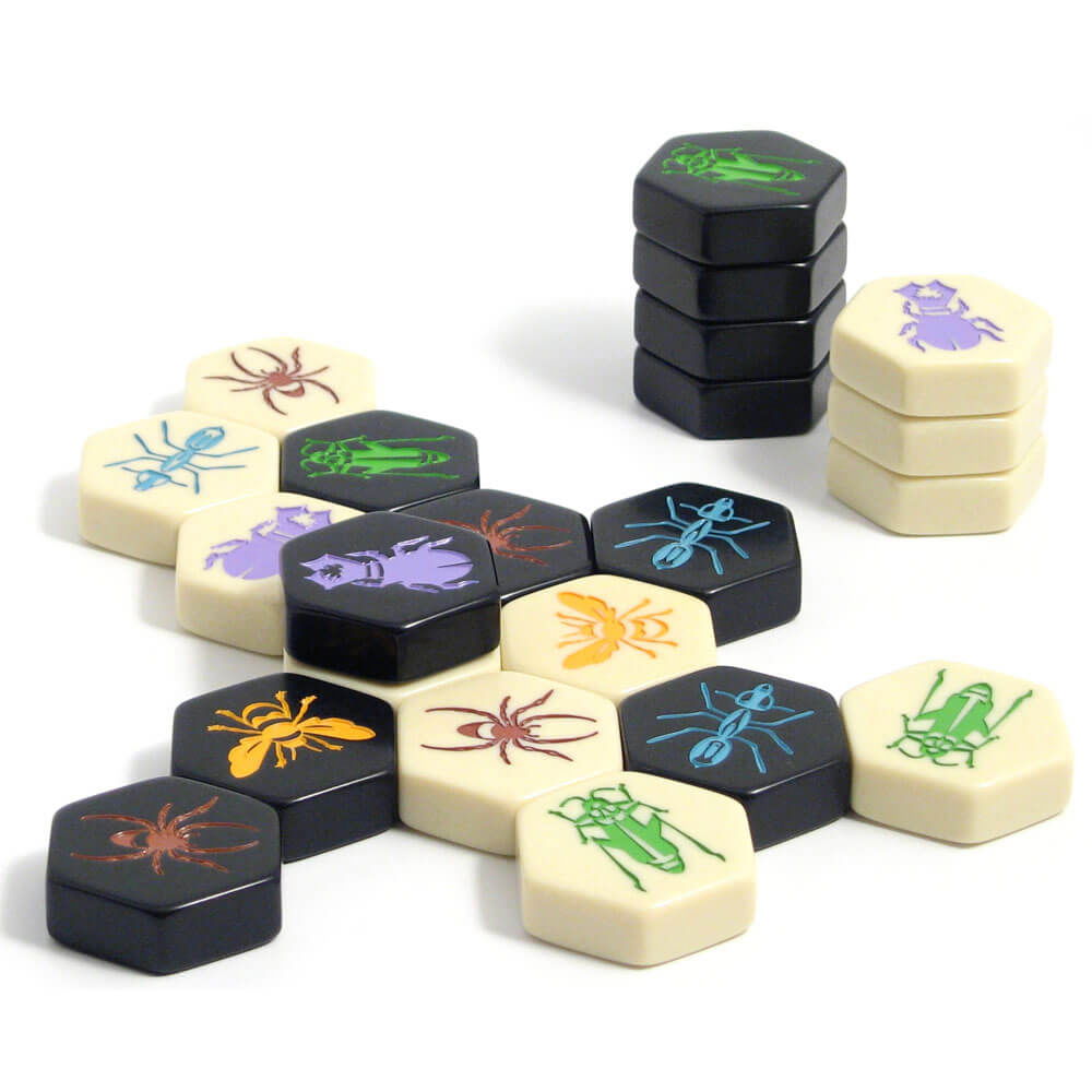 Fiecare jucator va avea cate 11 piese, de culoare alba sau neagra, cu imagini a 5 tipuri de insecte: 3 greieri, 3 furnici, 2 carabusi, 2 paianjeni si 1 albina.