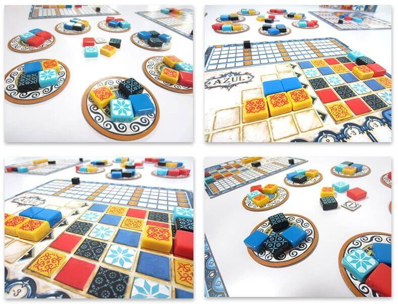 Scopul jocului Azul (RO) este de a aduna cat mai multe puncte prin realizarea de linii sau coloane de un anumit model si prin completarea uneia sau mai multor culori.