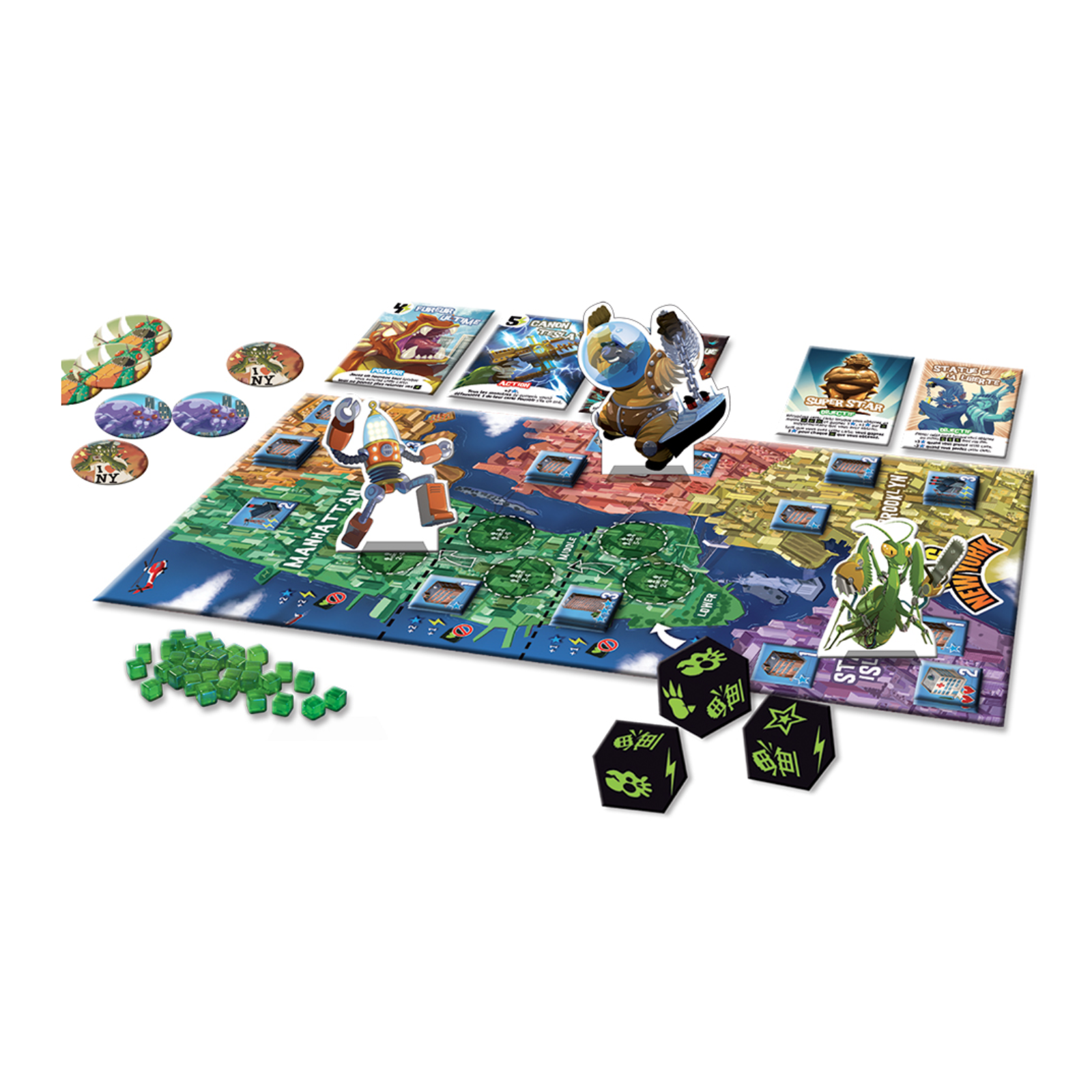 figurine cu monstri, tabla de joc New York, zaruri personalizate, 66 de carti, token-uri de energie si puncte de victorie, carti cu puteri speciale si instructiuni detaliate.