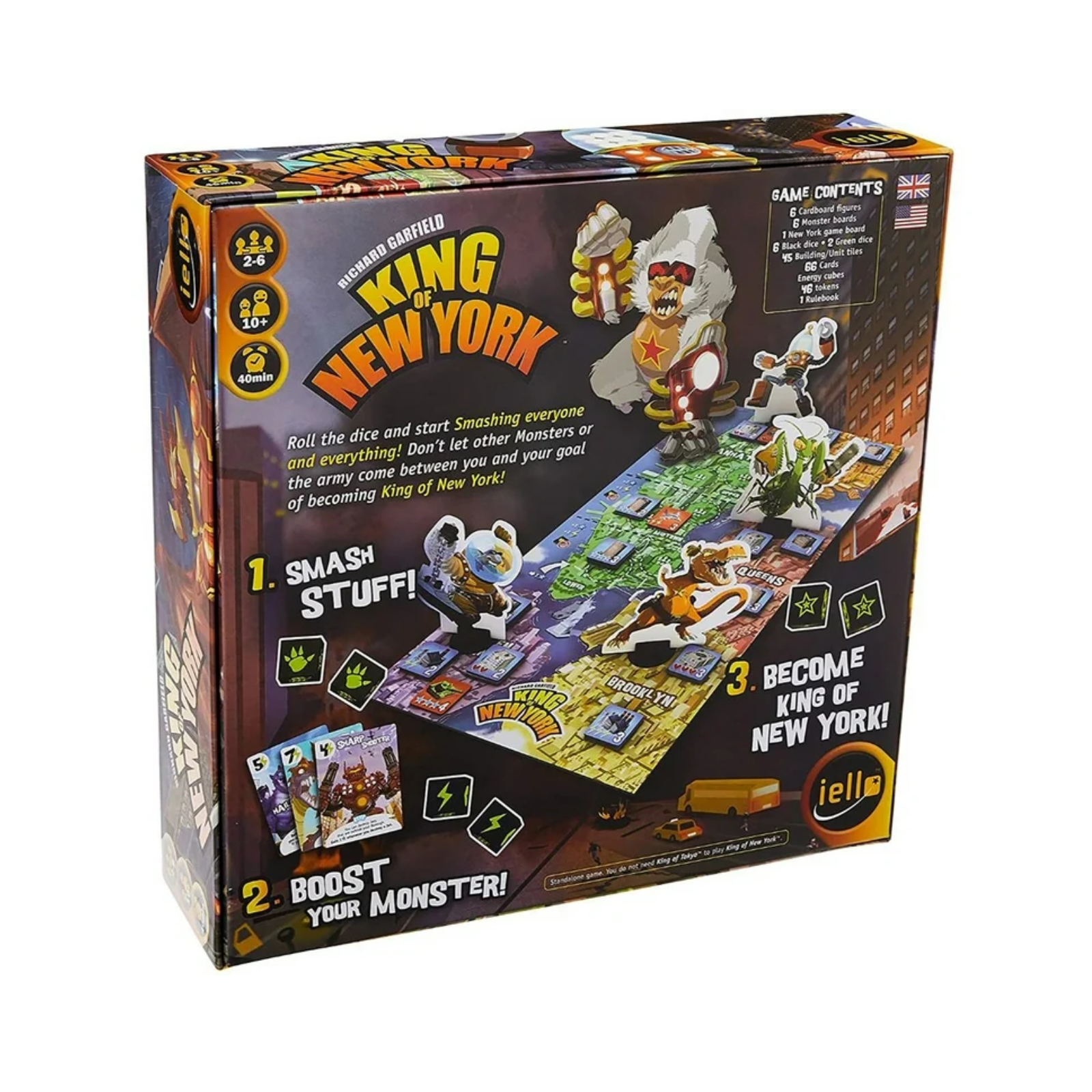 In King of New York (EN), jucatorii se muta prin cartierele orasului, distrugand cladiri pentru a obtine bonusuri de energie si puncte de victorie sau riscand sa atraga atacuri ale armatei. Adaugarea noilor zaruri speciale si a cartilor de puteri transforma fiecare partida intr-o lupta epica pentru cucerirea orasului. Este un joc de strategie, noroc si decizii riscante, in care jucatorii pot alege intre a juca agresiv sau defensiv, iar fiecare alegere poate influenta intregul curs al jocului.