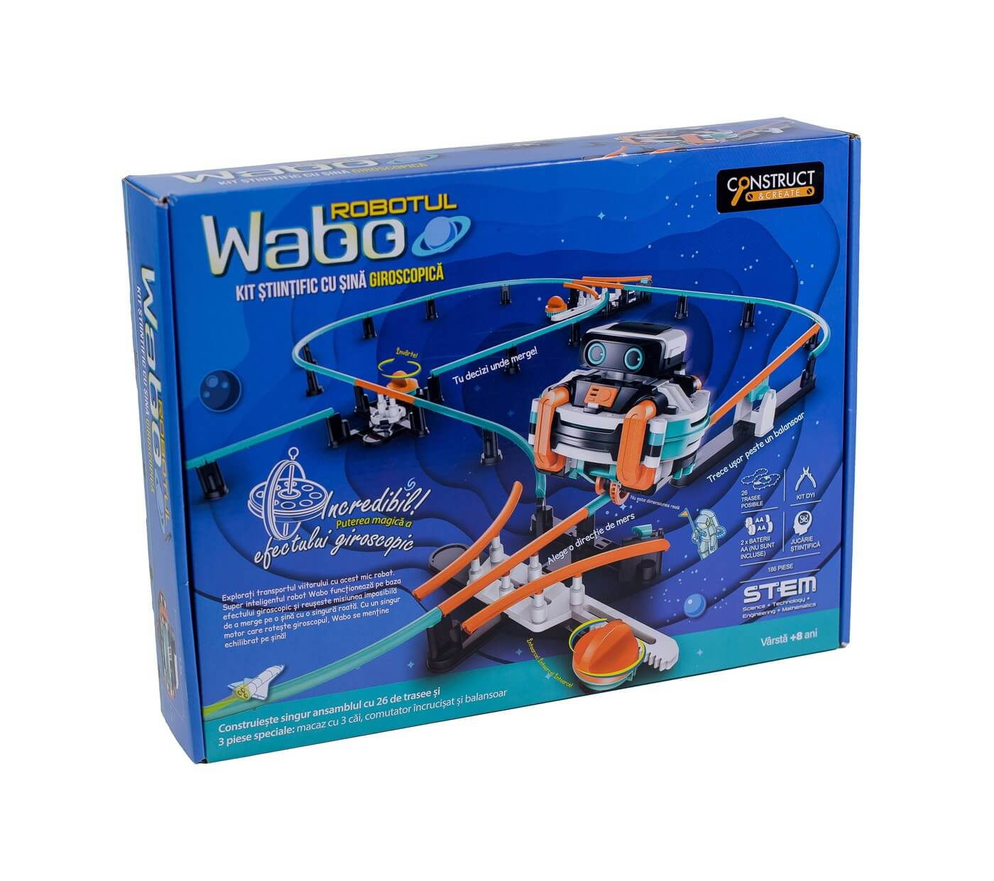 Construieste pana la 26 de trasee si alte 3 piese speciale, totul pentru a testa puterea magica a acestui Kit Constructie Robot Wabo cu sina giroscopica (RO).