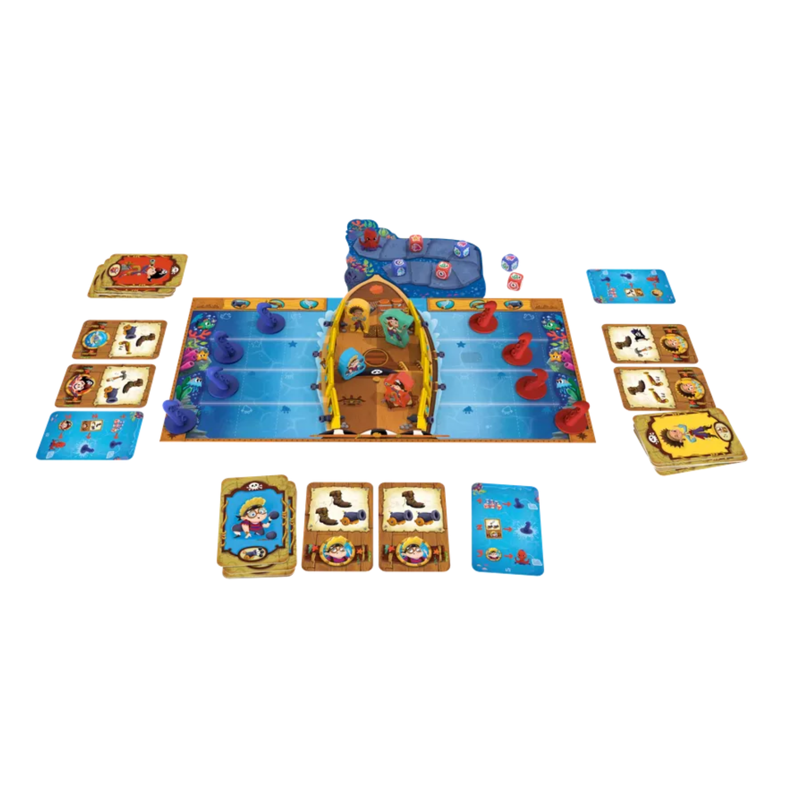 tabla de joc nava, 8 figurine tentacule, 4 pioni pirati, zaruri speciale, jetoane de atac si de daune, carti de actiune si instructiuni.