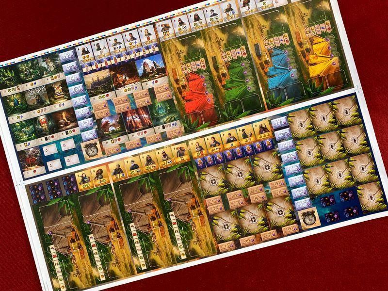 1 tabla de joc principala cu doua fete, 4 table de joc individuale cu doua fete, 1 tabla de joc cu doua fete cu resurse, 110 cartonase, 8 arheologici din lemn, 8 jetoane de cercetare din lemn, 16 piese idol, 15 piese gardian, 12 piese asistent, 18 piese recompense de cercetare, 12 piese templu, 5 piese blocare, 14 piese actiuni rivale, 27 monede din carton, 27 busole din carton, 16 jetoane din plastic pentru tabla, 12 varfuri de sageata din plastic, 9 bijuterii din plastic, 10 piese frica, 1 toiag lunar din carton, 4 foi referinte rapide, 1 regulament.