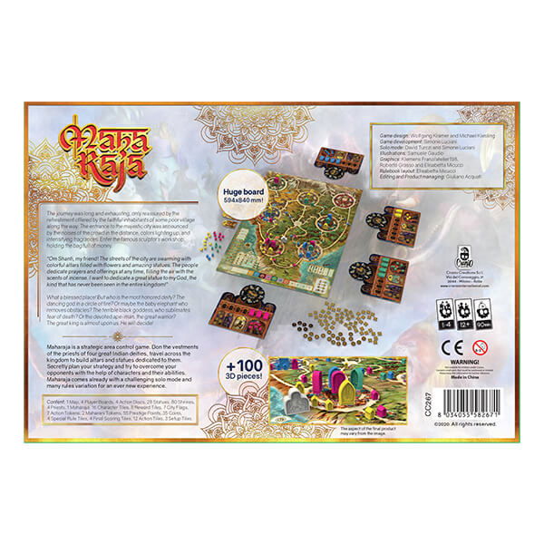 1 harta, 4 table de joc, 4 discuri Actiuni, 28 de Statui, 80 de Altare, 4 Preoti, 1 Maharaja, 16 tablite Caracter, 8 tablite Recompensa, 7 steaguri ale oraselor, 7 jetoane Actiune, 2 jetoane Maharani, 55 puncte de victorie, 35 Monede, 4 tablite Reguli Speciale, 4 tablite Scor Final, 12 tablite Actiuni, 3 tablite Organizare.