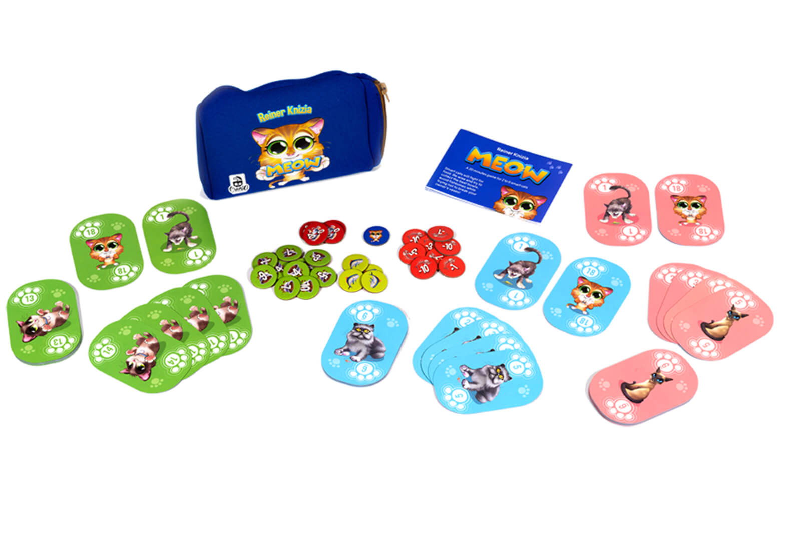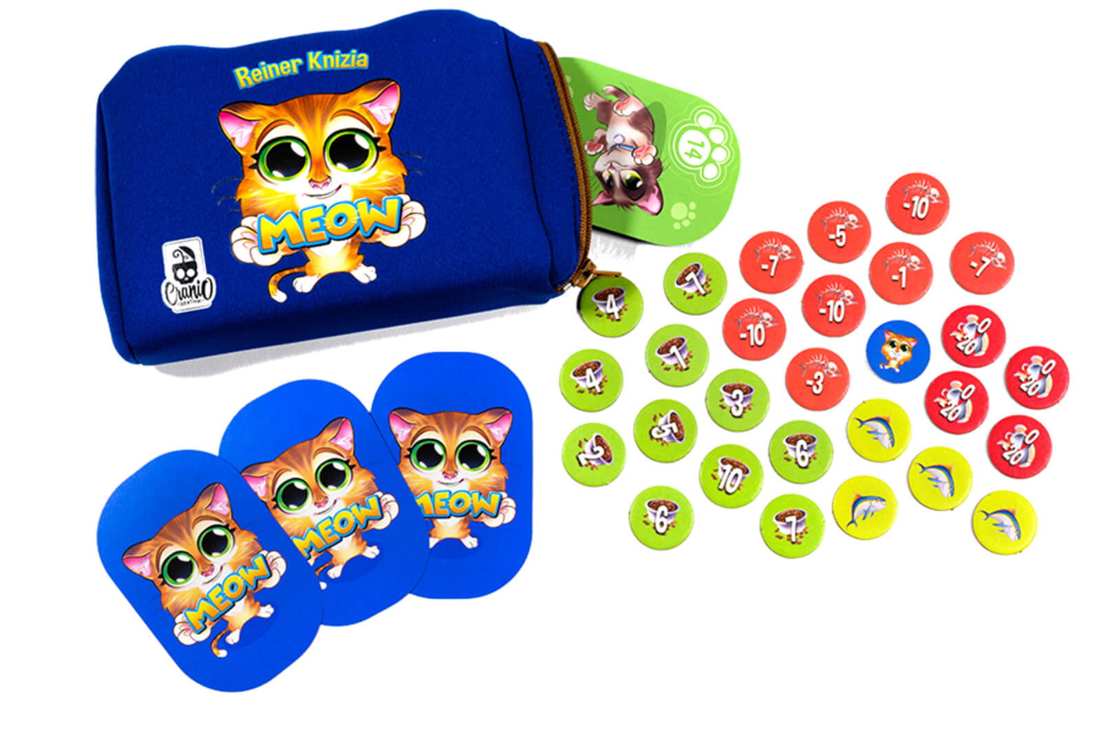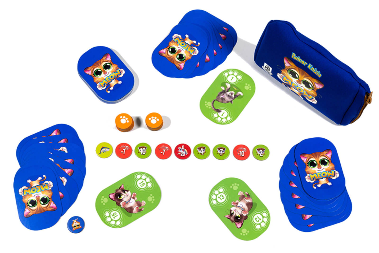 57 de cartonase Pisica, 27 Jetoane Recompensa, 1 jeton pentru primul jucator si instructiuni de joc.