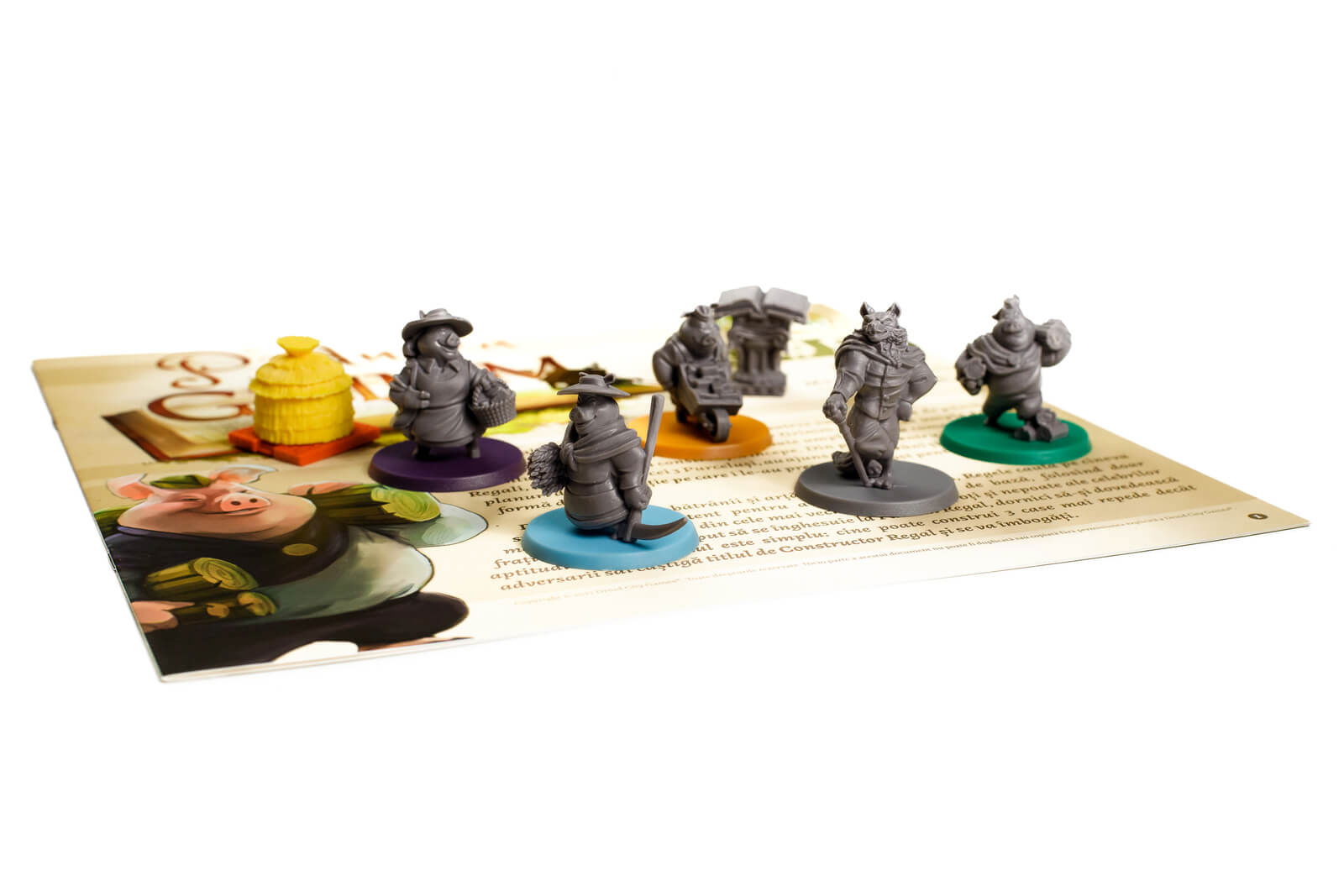 4 Locatii de Adunare, 4 Table pentru jucatori, 16 carti de Adunare, 4 carti ajutatoare pentru jucatori, 45 sectiuni de case, 58 carti Fabula, 25 carti Prieten, 50 Resurse simple, 15 mega Resurse, 3 piese Bonus Primul Constructor, 4 miniaturi Porcusori, 6 miniaturi Personaje Negative, 1 miniatura pentru primul jucator, 1 zar „Printul Regal”, instructiuni in limba romana.