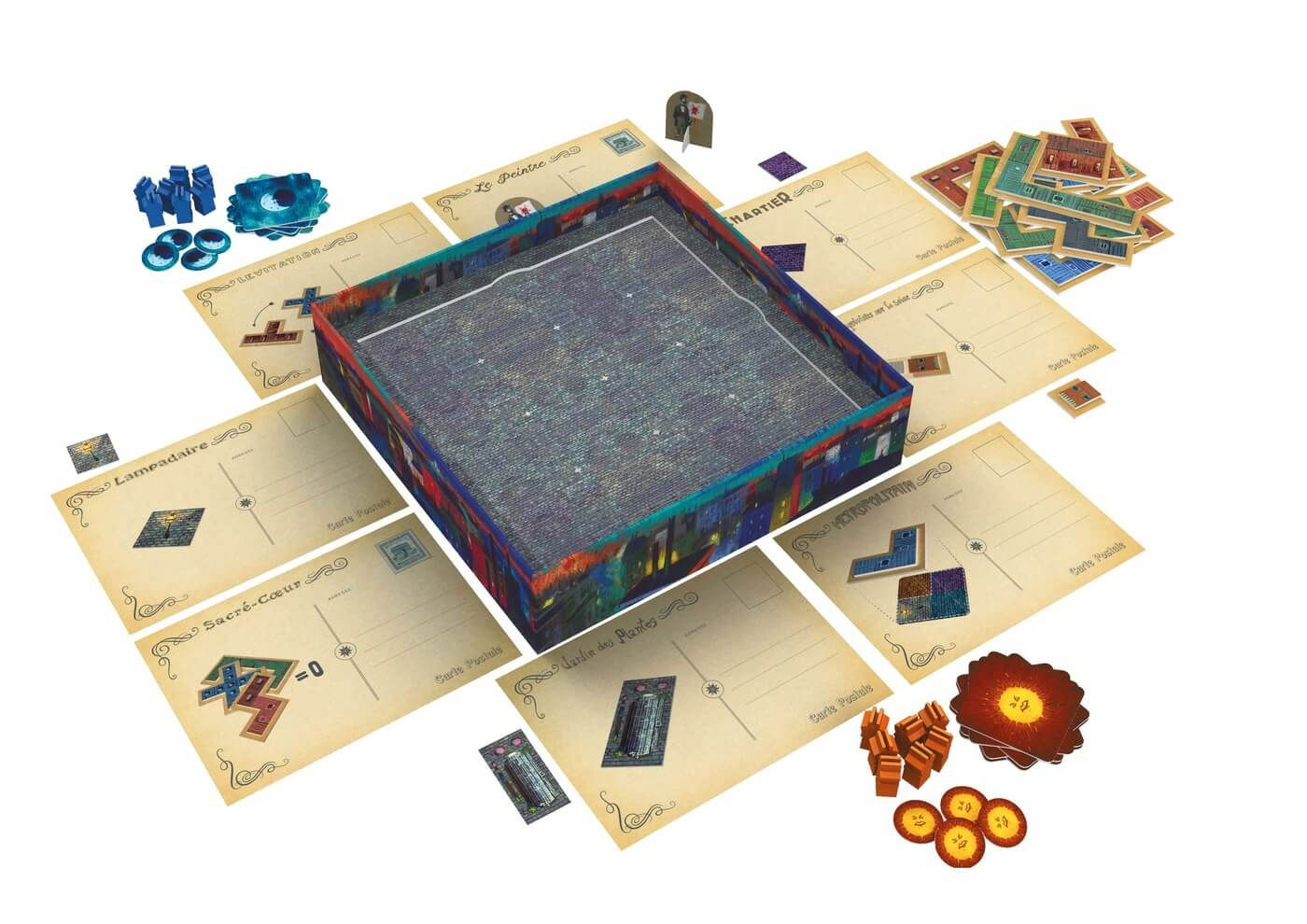 16 placute pavaj patrate, 12 piese cladire, 1 plansa de joc incorporata in cutie, 14 cosuri de fum, 8 jetoane de actiune, 12 carti postale cu actiuni, 9 piese speciale (Pictor, Dansatoare, Pavaj Mixt, Fantana, Statuie, Felinar Stradal, Felinar Stradal Mare, Anexa, Gradina Botanica), manual de instructiuni.