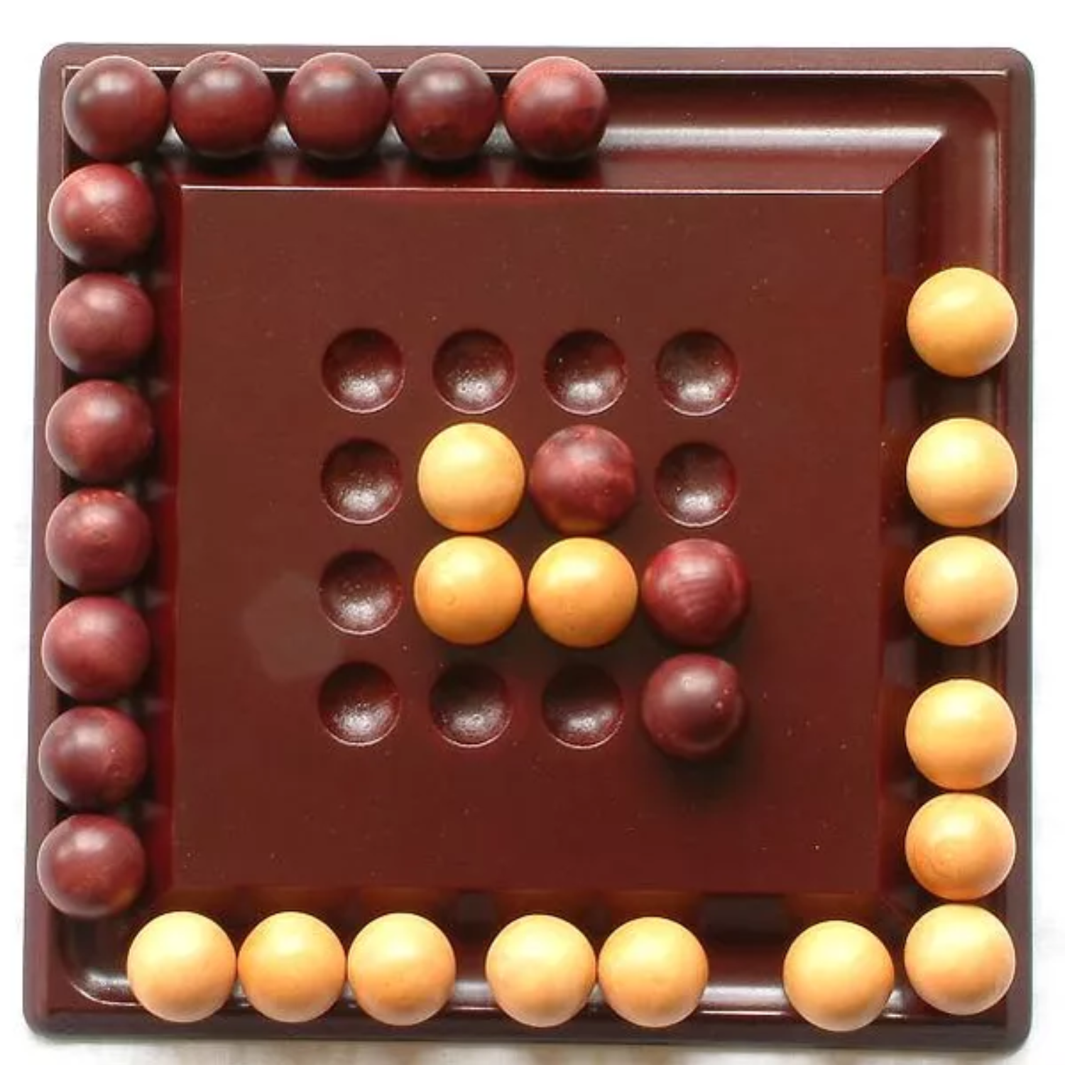 1 tabla de joc din lemn, 30 bile din lemn (15 pentru fiecare jucător), saculet textil pentru depozitare, instructiuni.