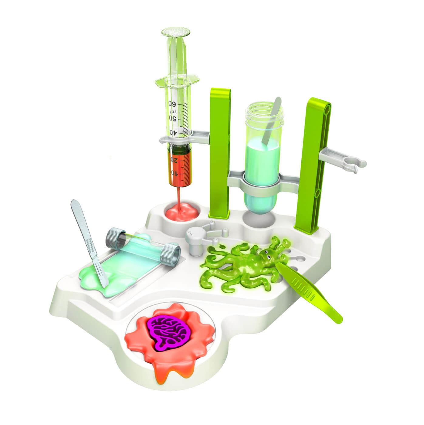 baza de experimentare + tije, capac mare, stampila cap de extraterestru, forma de decupare in forma de creier, eprubeta mare, eprubeta mica, seringa, pipeta, penseta, spatula, bisturiu de plastic, vas Petri, ochi, pudra pentru slime (rosie, galbena si fosforescenta), pudra pentru slime care isi poate schimba culoarea, sclipici extraterestru, abtibilduri si instructiuni in limba romana.