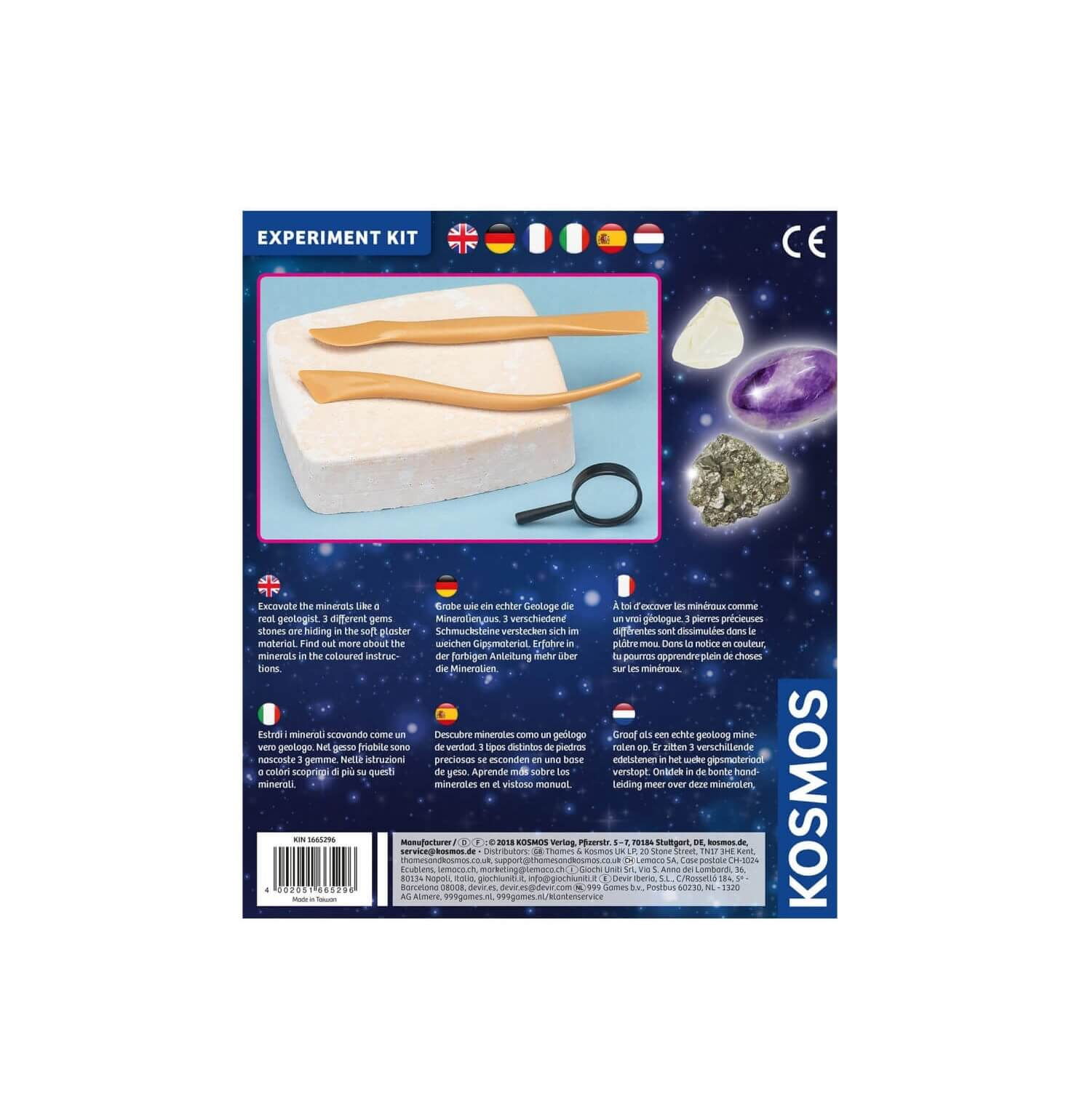 1 bloc de ipsos cu 3 minerale (cristal de stanca, ametist, pirita), o mica lupa, 2 ustensile pentru sapat si instructiuni in limba romana.
