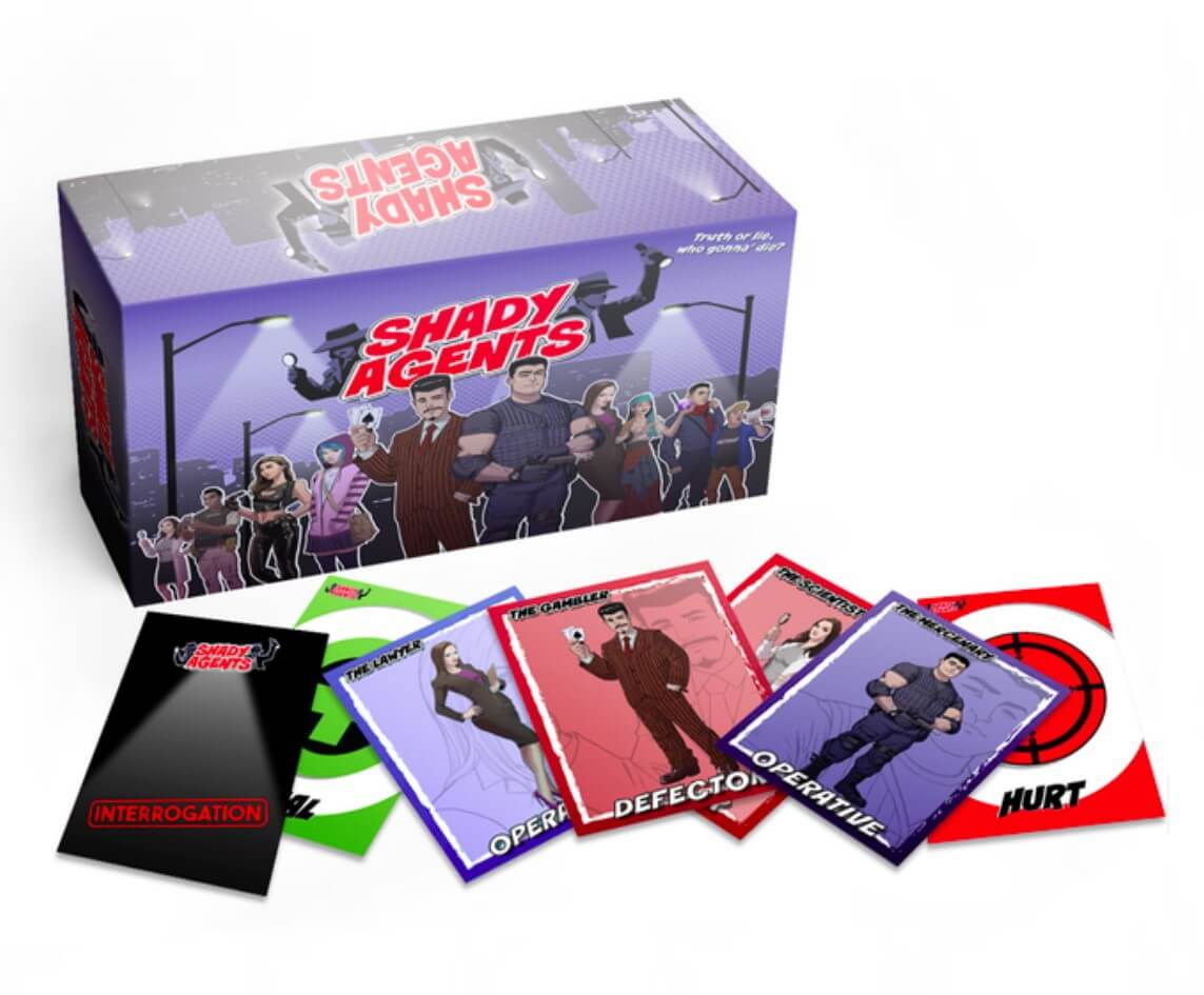 In Shady Agents (EN), fiecare jucator interpreteaza, in secret, cate un Agent sub acoperire, fie onest, fie corupt. Prin adresare de intrebari, jucatorii trebuie sa descopere ce fel de Agent este fiecare jucator in parte, sa isi ajute agentii din echipa sa si sa ii raneasca pe cei din echipa adversa.