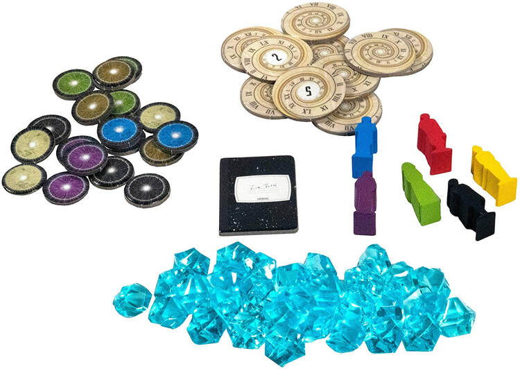 65 cartonase Element (Materie neagra, Flux, Neutrini, Paradox si Tahioni), 10 jetoane Eveniment, 30 Cristale combustibil, 1 indicator Invariabil, 18 discuri Control, 6 pioni Calator, 6 cartonase Masina Timpului si instructiuni de joc in limba engleza.