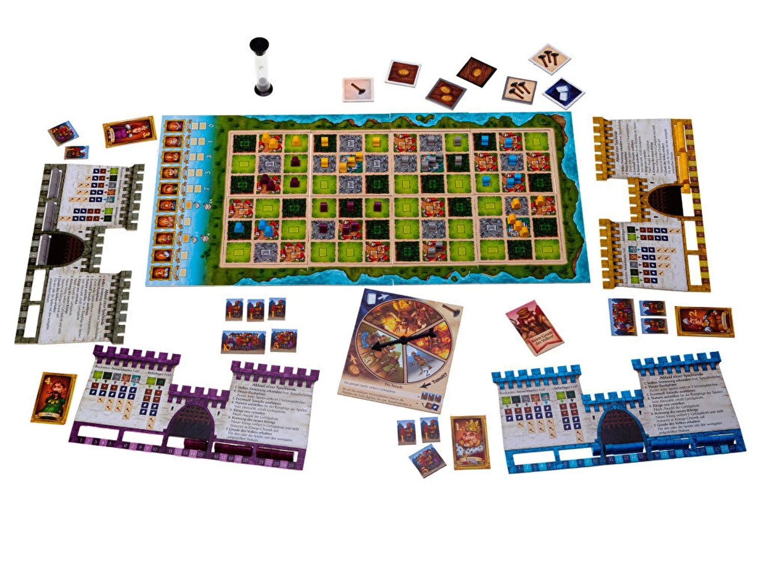 100 statui, 39 jetoane cu bunuri, 37 jetoane cu sustinatori, 10 placute cu regiuni, 6 piese, 4 planse cu castele, 4 carti cu personaje, 4 carti de mila, 1 disc al revoltei, 1 clepsidra, 1 regulament.