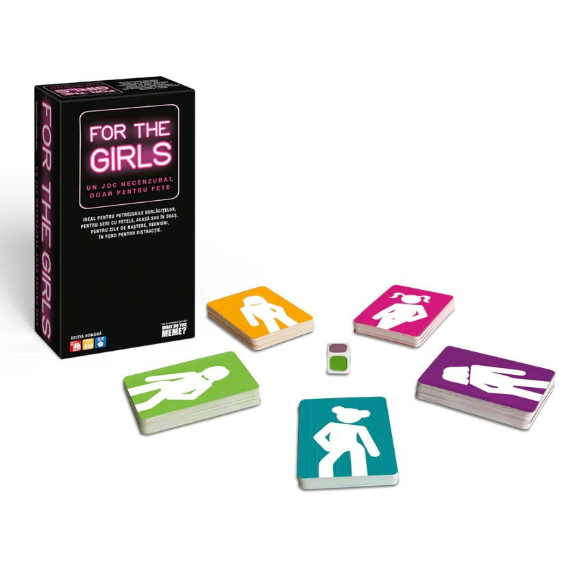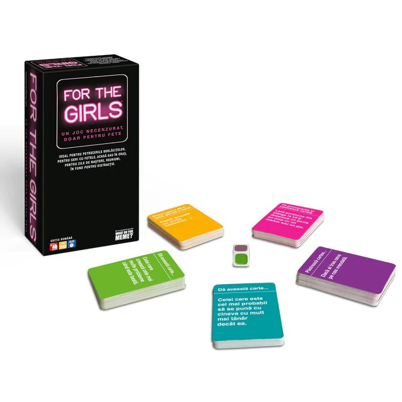 80 de cartonase roz, 80 de cartonase violet, 80 de cartonase portocalii, 80 de cartonase verzi, 80 de cartonase albastre, 1 zar cu sase fete, instructiuni in limba romana.